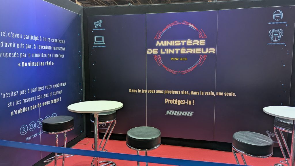 A noter la présence de stands dédiés à la Police Nationale qui invite les participants à participer à une intervention, fusil au poing, et à France Travail qui invite les joueurs à… nan, rien, y’a personne sur le stand (et c’était la même chose le vendredi soir).