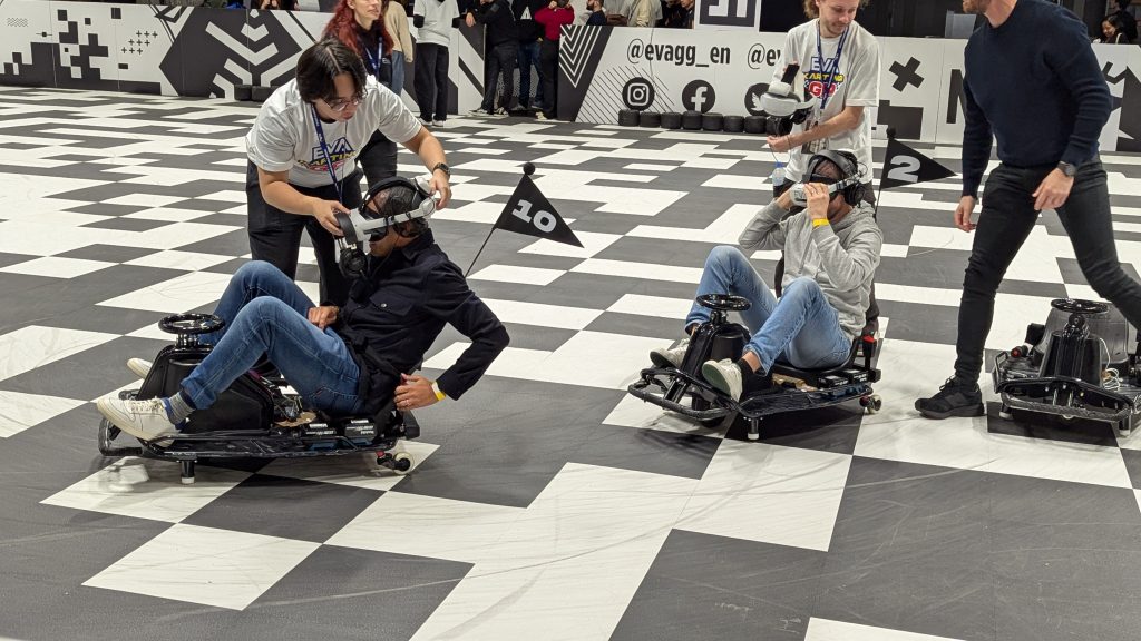 A noter également la présence d’un espace dédié au cosplay et du stand EVA Karting GP qui permettait de jouer à un jeu de Karting sur de simili karts, un casque de réalité virtuelle bien vissé sur le cortex. https://www.eva.gg/fr-FR/eva-karting-gp