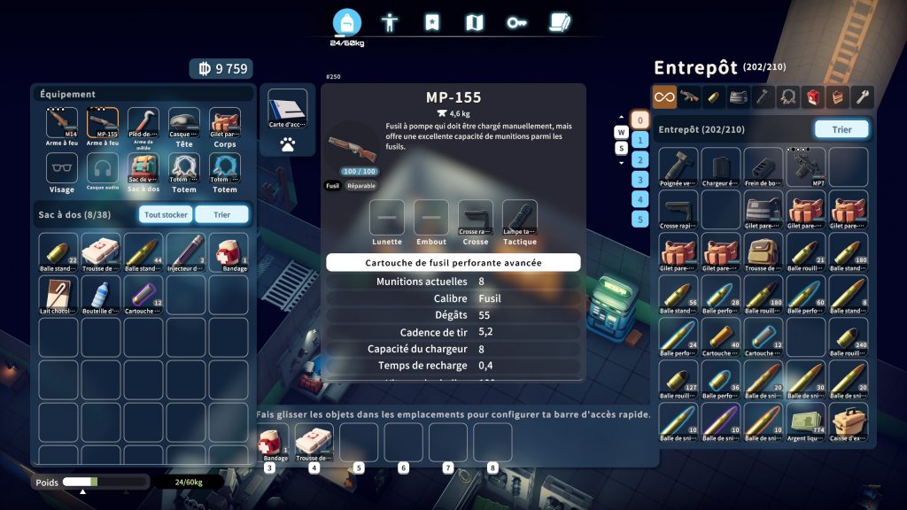 Là encore comme dans Tarkov, la mort n’est pas synonyme de fin du jeu. Vous réapparaissez dans votre planque, délesté de votre matériel. Il faut donc soit vous rééquiper entièrement avec ce qu’il vous reste dans votre réserve, soit partir léger et tenter de récupérer le matériel laissé sur votre cadavre du raid précédent.