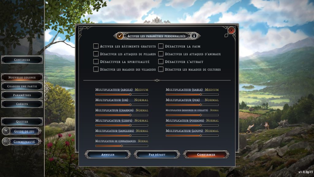 Farthest Frontier vous propose de guider vos colons loin de toute civilisation afin de bâtir un hameau, puis une ville, sur une carte dont vous définissez les caractéristiques générales (taille, type…) puis vient le niveau de difficulté, qui détermine la quantité de ressources disponibles ainsi que la présence plus ou moins importante de forces hostiles et de maladies.