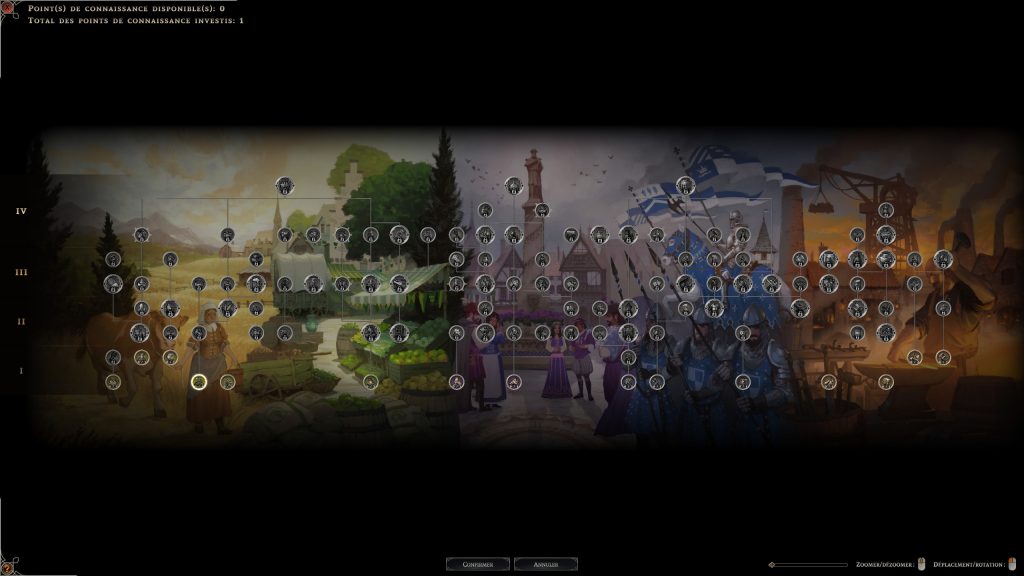 Vous avez bien lu, outre l’aspect construction/récolte, Farthest Frontier dispose d’un arbre technologique très bien fourni. Chaque nouveauté se débloque en dépensant un point de connaissance. Ces points sont générés par l’hôtel de ville, les fouilles de ruines, la destruction des camps de pillards, l’achat chez les marchands itinérants puis plus tard par le biais de notre académie que nous fournirons en papier pour faire avancer plus vite les recherches (et hop, une nouvelle chaine de production !).