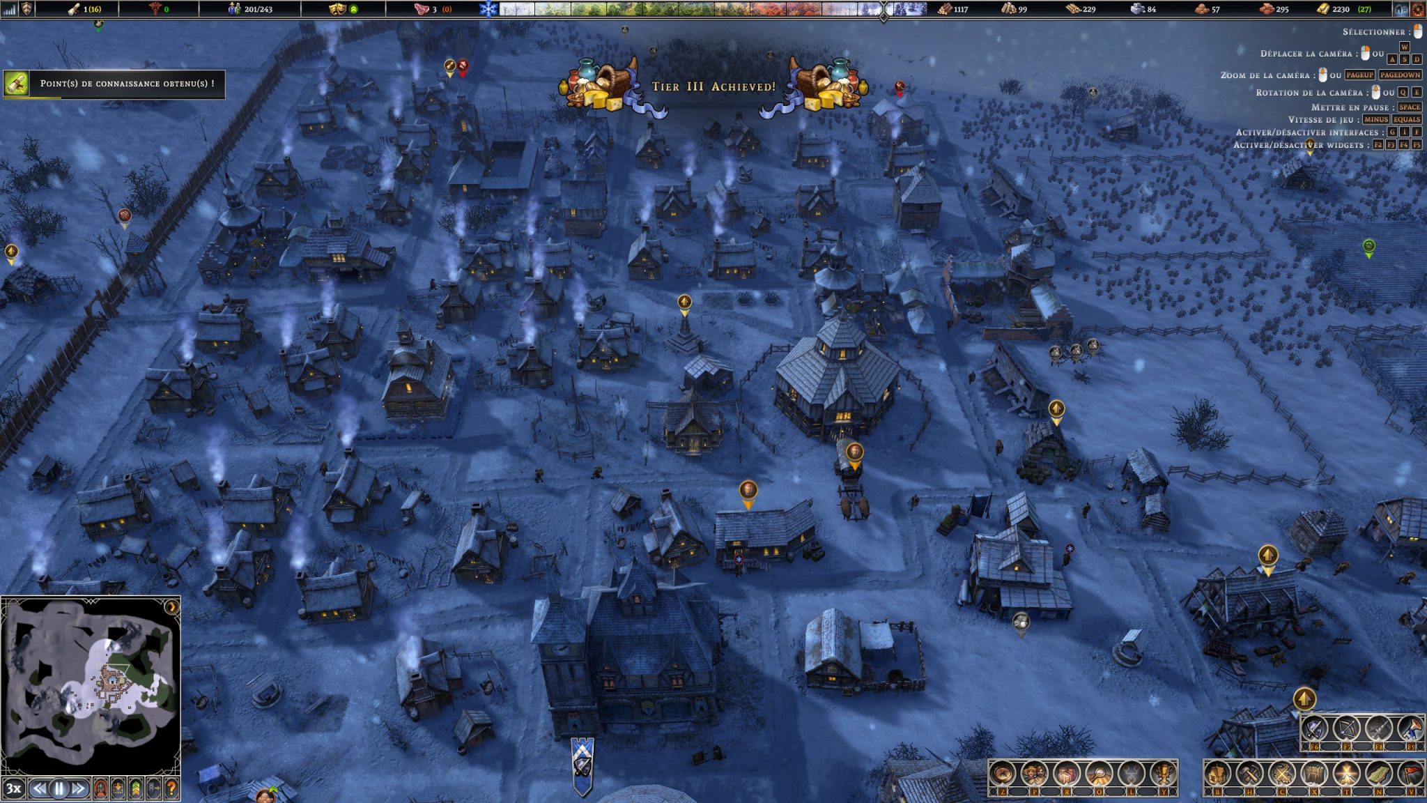 Vous avez bien lu, outre l’aspect construction/récolte, Farthest Frontier dispose d’un arbre technologique très bien fourni. Chaque nouveauté se débloque en dépensant un point de connaissance. Ces points sont générés par l’hôtel de ville, les fouilles de ruines, la destruction des camps de pillards, l’achat chez les marchands itinérants puis plus tard par le biais de notre académie que nous fournirons en papier pour faire avancer plus vite les recherches (et hop, une nouvelle chaine de production !).