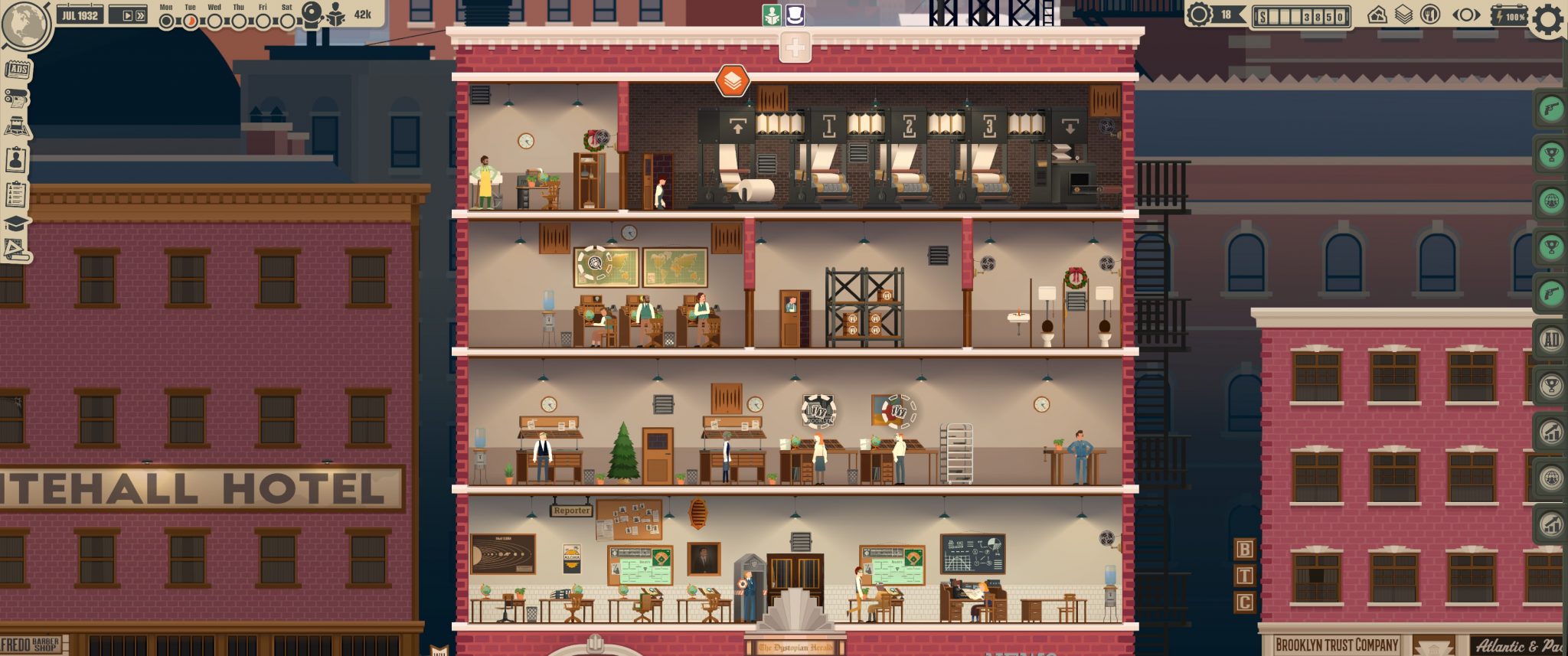 Complet ? Oui, car dans News Tower il y a Tower, ce qui veut dire que vous allez devoir gérer les locaux de votre feuille de chou. Acheter des bureaux spécialisés, gérer le mobilier, les emplacements de travail, le bruit et la chaleur occasionnés par la presse. Mettre des fontaines à eau, embaucher quelqu’un pour déboucher les toilettes. Agrandir le bâtiment. Et payer tout ce petit monde. Acheter du papier, des fournitures, entraîner ce personnel… Si au niveau interface cela n’est pas parfait, cette gestion de vos locaux est très amusante et permet d’observer tout ce petit monde s’agiter et vaquer à ses occupations. Et attendre en se trémoussant devant des toilettes occupées.