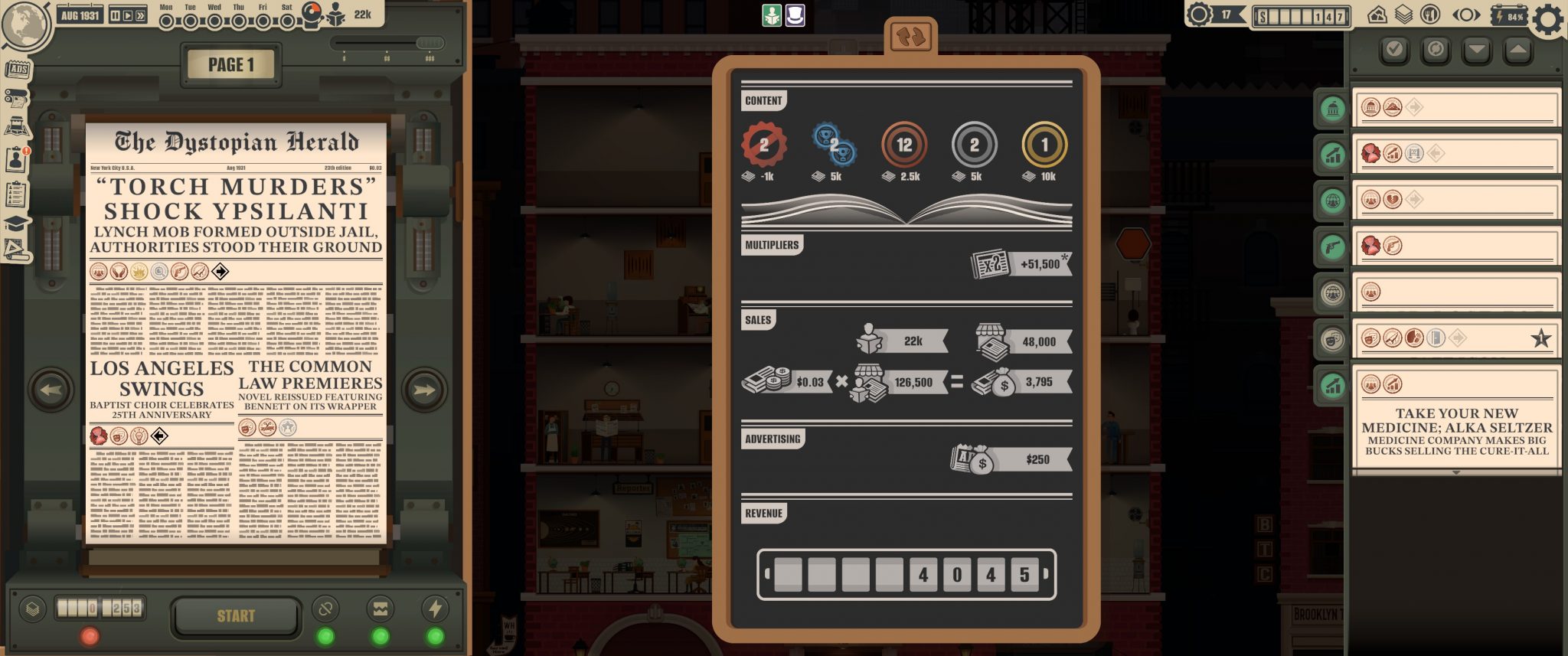 Rajoutez à cela la gestion de l’orientation de votre journal, plus ou moins fiable ou scandaleux – oui, comme dans Dystopeek vous pourrez publier des fausses news et de la propagande, c’est à ça que Baalim sert chez nous – qui vous rapportera plus ou moins de possibilités de publicités ou de récompenses et la compétition des autres journaux et vous obtenez un titre touffu et complet.