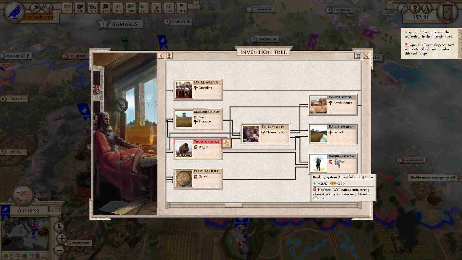Comme dans la plupart des jeux du style, c’est la carte qui fait tout. Ici on a le choix entre en générer une au hasard ou utiliser celle de la méditerranée (la seule qui vous permettra de débloquer les achievements steam et qui a un intérêt historique), une fois fait il restera à sélectionner votre civilisation. Alors contrairement au jeu éponyme chaque civilisation n’a qu’une réelle différence majeure (outre sa couleur et ses objectifs) qui n’est autre que son emplacement de départ. Cela en décevra plus d’un mais il y’a en fait assez peu d’éléments historiques qui permettent d’enrichir nos connaissances ou de raviver nos désirs de combats sans merci entre une armée d’hoplites aux légions romaines. C’est possible bien sûr mais ça ne vous sera pas réservé car bien que le niveau technologique varie, chaque civilisation a la possibilité de produire tous les types d’unités.