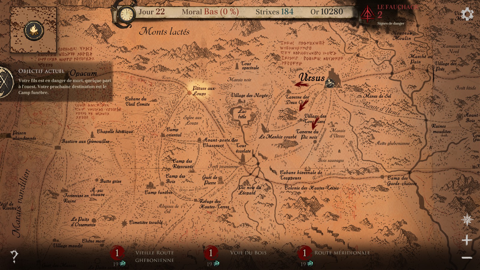 L’exploration : les personnages sont invités à se déplacer dans le monde du jeu et, pour se faire, ils se déplacent sur une énorme carte. La route n’est pas totalement linéaire et très régulièrement, on est invité à choisir la direction à prendre. Je conseille vivement de choisir les routes fréquentées pour avoir suffisamment de Strixes afin de ne pas voir mourir la moitié de son équipe avant un combat ou pire, avoir ses combattants tellement faibles que le combat va être quasi impossibles à gagner. Pas d’événements aléatoires en vue, ni de grands moments épiques pendant cette partie, mais encore cette illusion du choix parce que la destination est la même, peu importe le chemin.