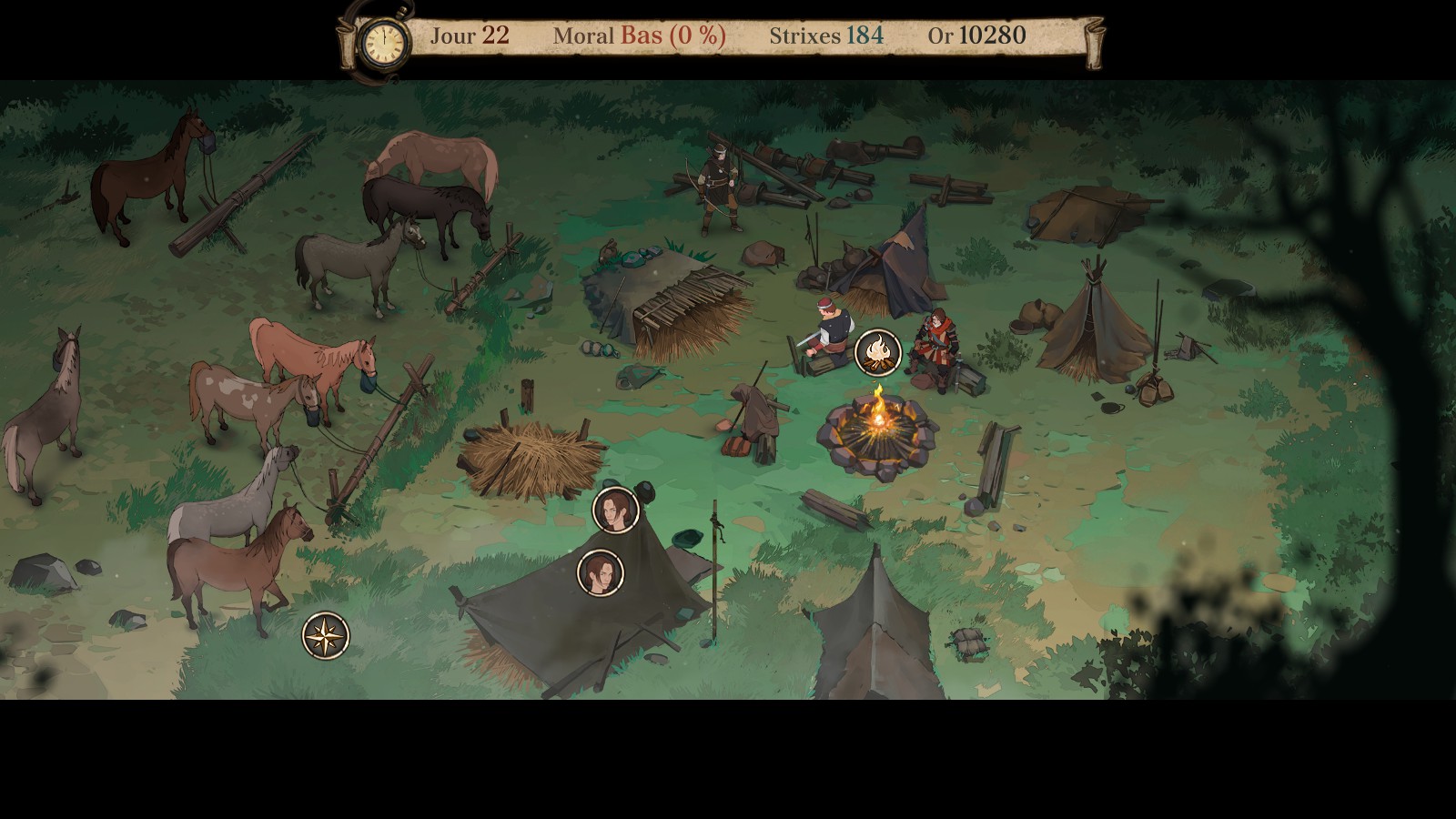 Dans The Banner Saga, cela avait peu d’impact de ne plus avoir assez de nourriture alors que dans Ash of Gods, c’est indispensable de gérer cet aspect. Quand un personnage a quatre blessures (mort en combat ou par manque de strixes), il meurt définitivement. Autant dire que tout le monde ne finira pas l’aventure…