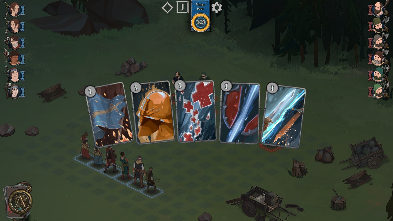 Les combats : Très fortement inspirés par The Banner Saga, ils consistent en du tour par tour assez classique avec classes, compétences et placement. Pour faire très simple, il faudra choisir entre attaquer l’énergie de l’ennemi ou sa santé en sachant que si un personnage n’a plus d’énergie, les coups portés à la santé sont doublés. Toute la subtilité sera de choisir entre privilégier l’affaiblissement de l’ennemi ou d’attaquer directement sa santé. Comme si cela ne suffisait pas, il est possible de jouer des cartes qui vont conférer des pouvoirs (certaines ne sont utilisables qu’à partir d’un certain nombre de tours). Pour en débloquer de nouvelles, il faudra en récupérer des fragments pendant le jeu. Et autre subtilité, on choisit le personnage à chaque tour qui va attaquer. Il ne sera disponible qu’après le passage de l’ensemble de l’équipe. Très important à savoir pour élaborer une tactique et surtout éviter de s’acharner sur un ennemi qui n’attaquera pas avant trois tours.
