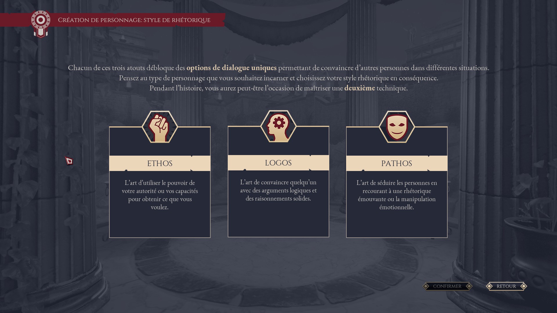 Tout d’abord, je précise que je connais la franchise Expeditions seulement de nom donc pas de comparatif avec les autres. Je ne suis pas trop difficile : tour par tour, Antiquité et jupettes à franges me font signer direct. Expeditions: Rome va un peu loin en proposant d’incarner un membre d’une famille noble romaine. Manque de chance, toute la famille a vu un glaive de trop près et il ou elle (bonne idée sur le papier) doit fuir en Asie Mineure pour sauver sa peau et se venger si possible. Le point de départ n’est pas très intéressant, mais offre la possibilité de choisir son genre (homme ou femme), sa classe, son « caractère » pour influer sur les dialogues.