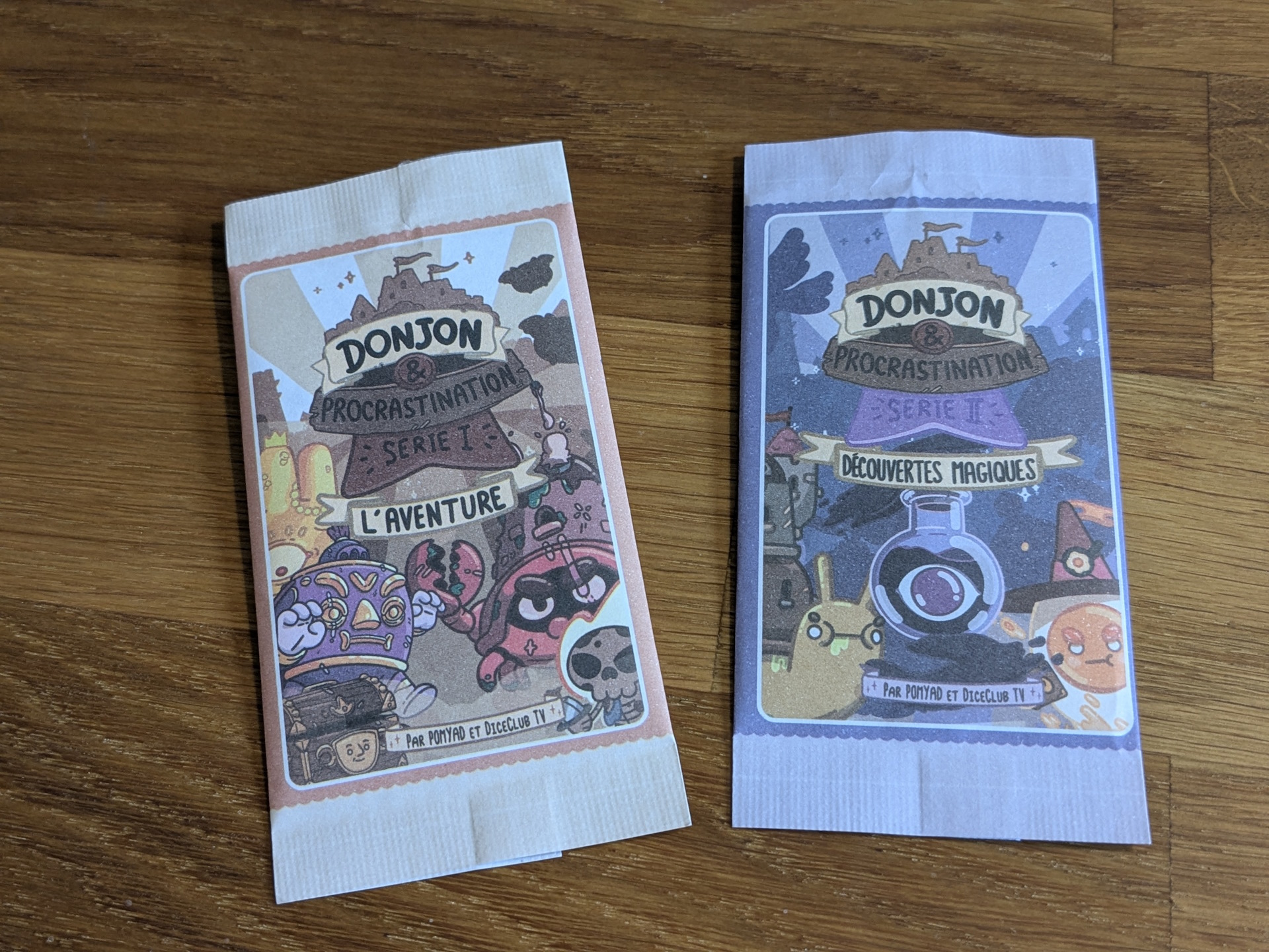Commençons par l’esthétique du jeu. Donjon & Procrastination fait partie de ces jeux dont le côté cosmétique devrait vous faire de l’œil. Les visuels, entièrement réalisés par Pomiad, ne sont pas sans rappeler des jeux comme Munchkin, le côté kawaii en plus : de l’emblématique Potichien à la Maingicienne en passant par le Niccolosse, on a affaire à une sacrée ménagerie. Chaque carte a une version dorée que vous pourrez trouver occasionnellement dans les boosters, permettant de mettre en valeur les cartes de votre paquet et de ravir les collectionneurs.