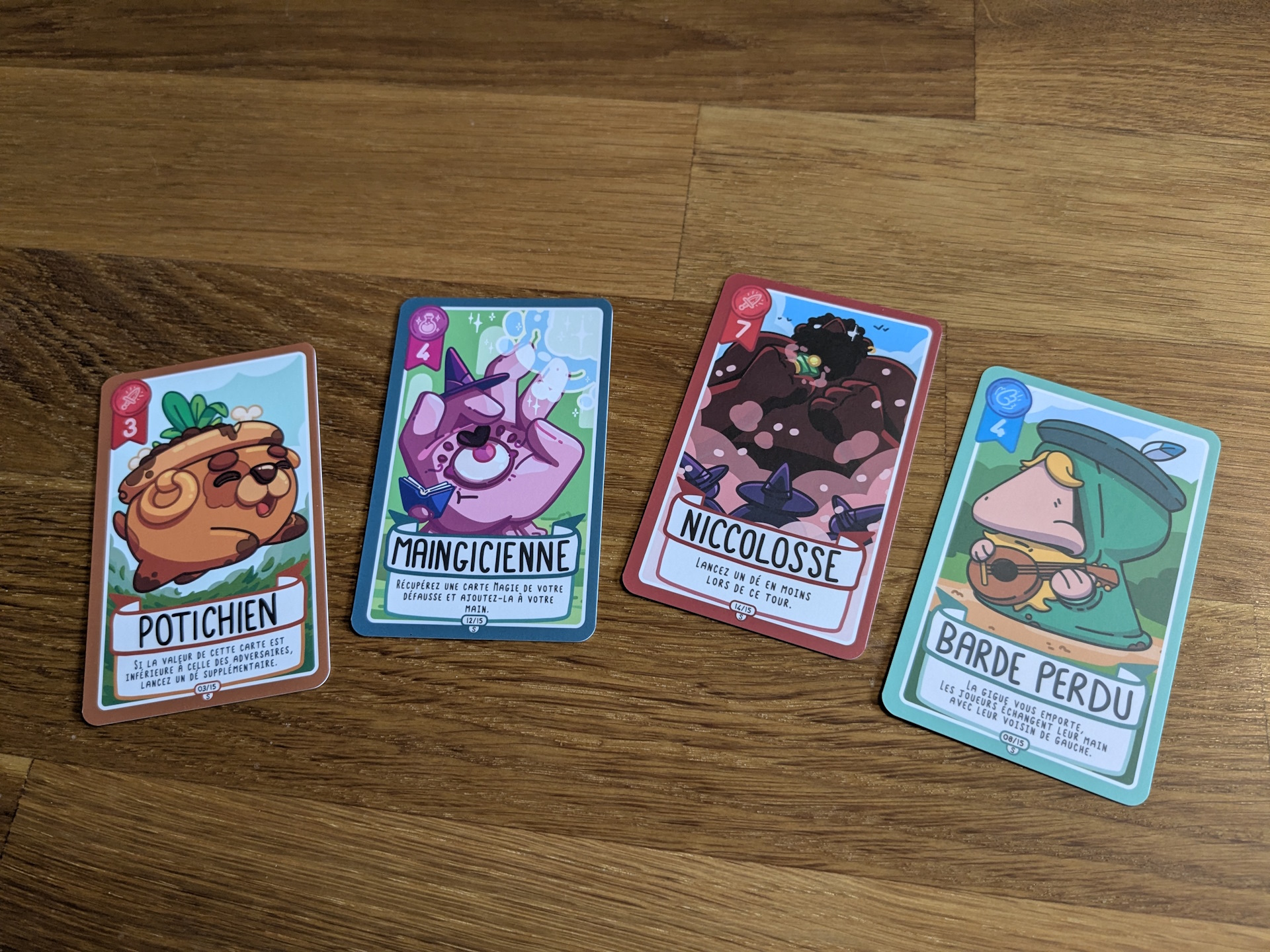 Les cartes sont bien pensées et ont des capacités vraiment différentes, allant de la récupération de cartes dans votre défausse à l’échange de votre main avec celle de votre adversaire… Aucune partie ne ressemble à la précédente, même si j’imagine qu’on trouvera une limite en jouant avec le même paquet tout un après-midi. La parade, c’est que rien de vous empêche de changer de paquet de départ, pour peu que vous ayez suffisamment de cartes pour vous le permettre. On notera enfin que le jeu de 3 à 6 joueurs est prévu, chaque joueur jouant alternativement contre son voisin de gauche puis de droite.