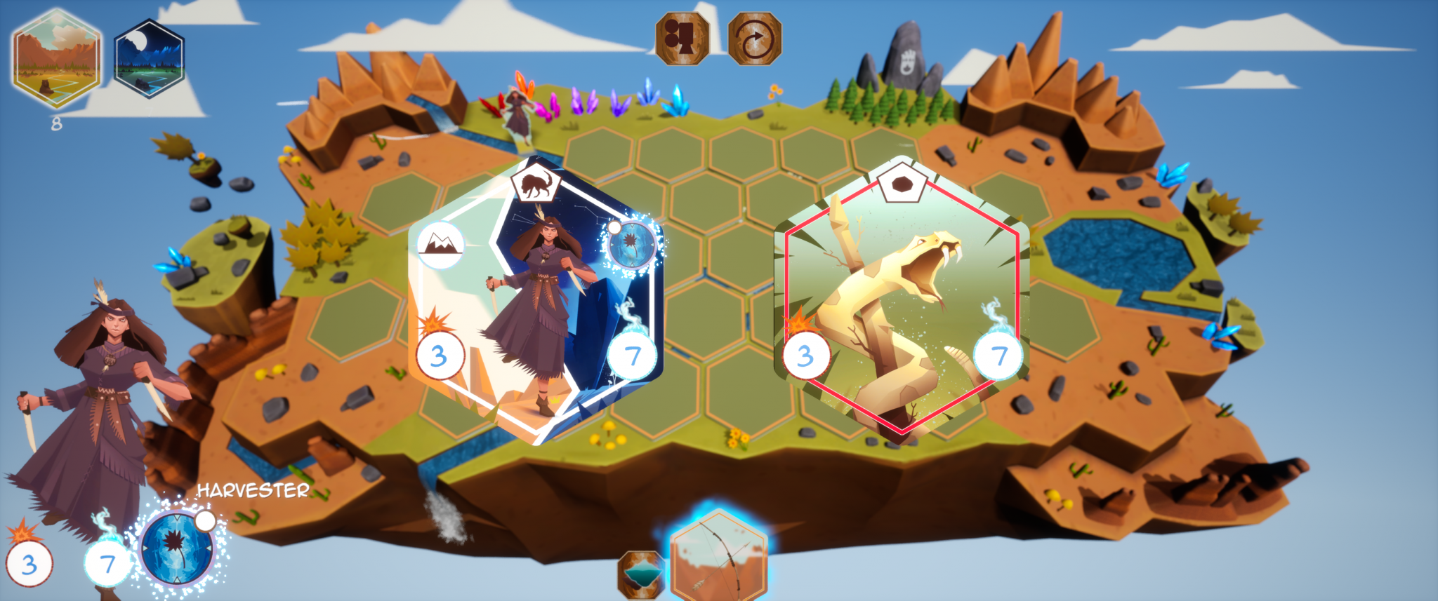 En effet, le plateau est composé de 51 tuiles hexagonales disposées face cachée vers lesquelles les héros vont se diriger (le héros peut aller sur n’importe quelle tuile adjacente à une tuile déjà découverte). Une fois dessus, la tuile est révélée et le héros doit réagir. Si c’est une offrande ou un bonus, il la collecte et continue son chemin. Si c’est un ennemi, il doit le combattre. Il y a 4 armes différentes dans le jeu (fronde, arc, couteau et tomahawk), chacune permettant de se débarrasser en un coup d’un animal (le tomahawk pour le crocodile par exemple) ou d’infliger un certain nombre de points de dégâts, en alternant les attaques.