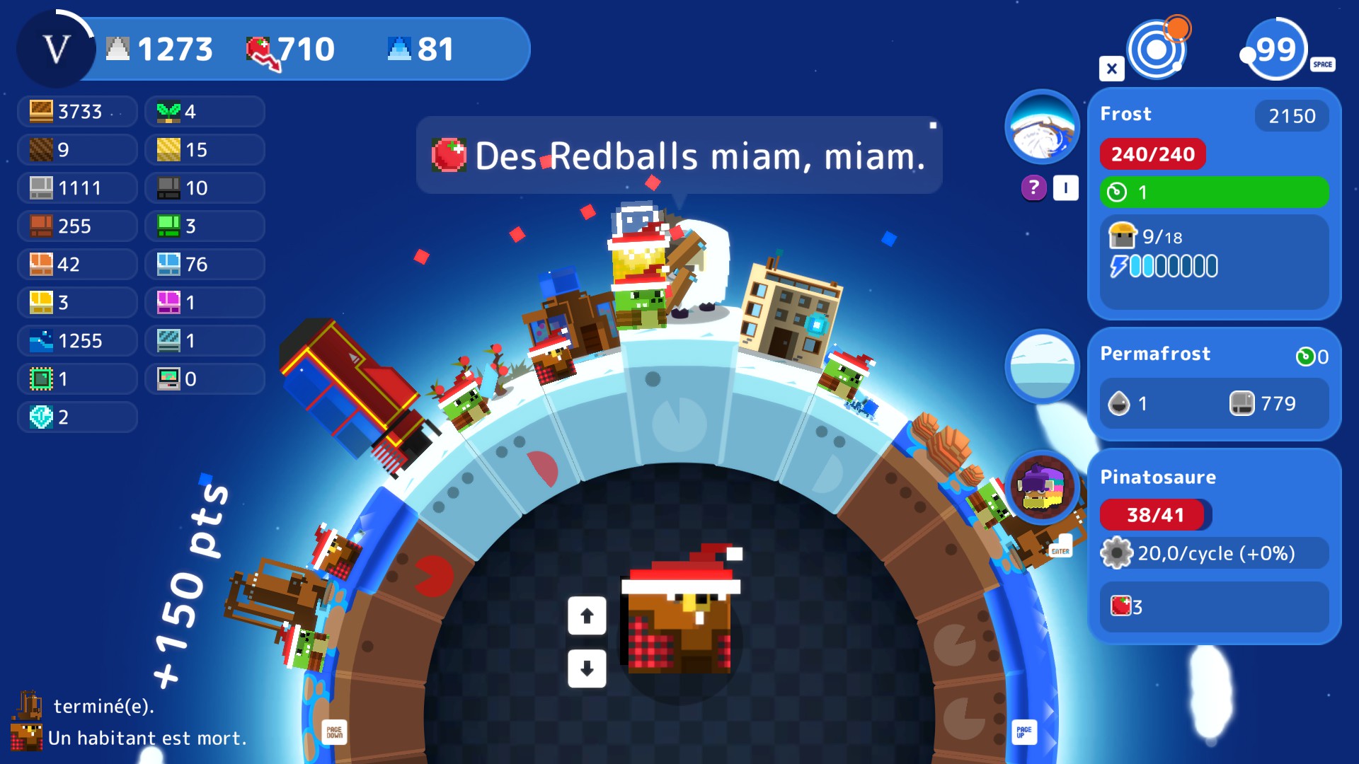 Chaque tranche de la planète a donc des spécificités (climat, sol riche en ressources liquides ou solides…) qu’il va falloir exploiter au mieux tant les ressources sont au départ peu variées. Notons que la seule réelle difficulté sera d’être capable de nourrir votre peuple, qui semble friand de petites boules rouges type tomates, les fameuses Redballs. Une simplification bienvenue car il y a de nombreux autres types de ressources qu’il n’est pas toujours évident de reconnaître.