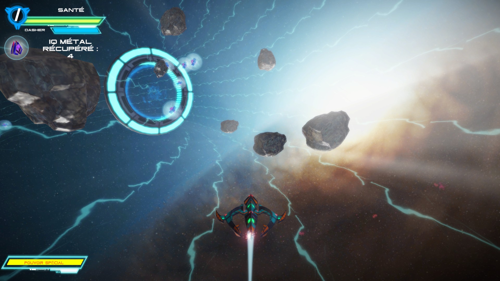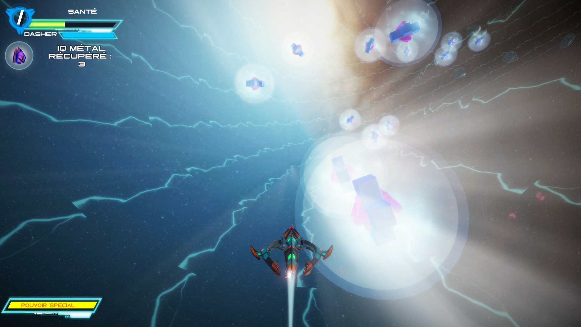 Le vaisseau est équipé d’une arme de base, qui peut être changée par une arme plus intéressante si on tire sur des cristaux. Il est aussi possible d’utiliser un bouclier qui protège des tirs ennemis et une épée servant à renvoyer les vaisseaux adverses, ainsi que les projectiles. L’épée a une très faible portée, mais peut se révéler utile dans certains missions où les bâtiments comme les vaisseaux sont équipés d’un bouclier mauve les protégeant des projectiles. A cela s’ajoute une super bombe qui détruit les ennemis sur une large surface. Le vaisseau répond bien et les contrôles sont agréables.