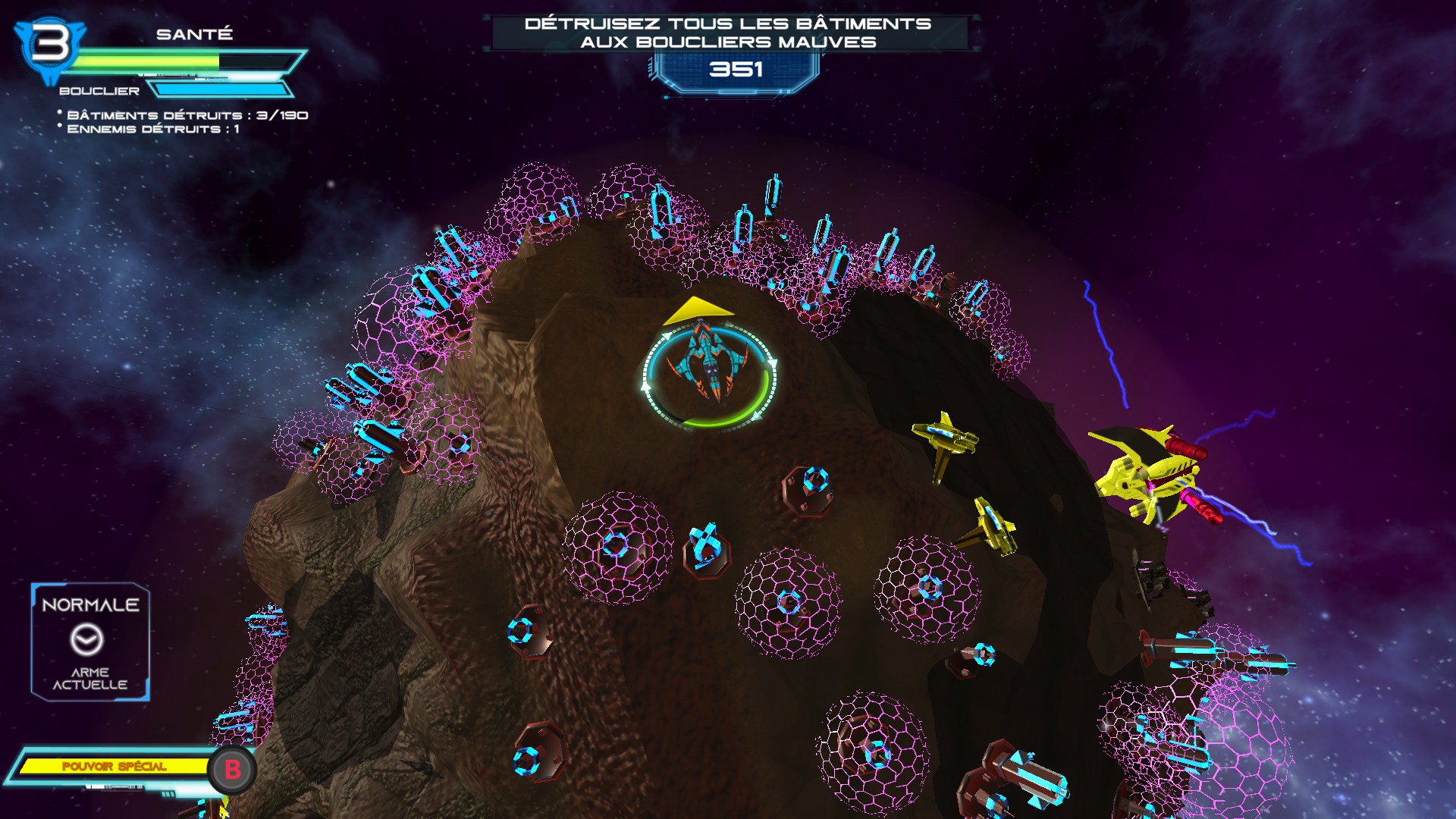 Concernant mon ressenti, je voulais bien aimer Aniquilation parce que les bons Twin Stick Shooter sont assez rares et l’idée d’avoir des niveaux sphériques me plaisait. Après quelques missions, je me suis retrouvé devant un jeu qui permet aux ennemis de traverser les obstacles que le joueur ne peut pas passer sans les détruire, un niveau entier avec des boucliers mauves sur tous les bâtiments ou presque (150 environ dans ledit niveau) donc obligation d’user de l’épée et dans un temps limité, des vagues avec un certain nombre d’ennemis à tuer, mais il en surgit toujours plus que le nombre prévu par la vague.
