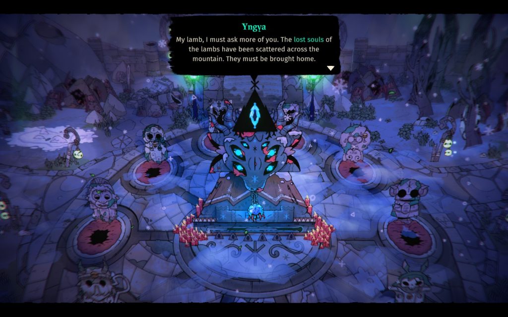 Bien entendu, l’ajout principal de Woolhaven, c’est cette nouvelle zone qui s’ouvre sur une montagne enneigée. Elle se divise en deux biomes. À la surface, la montagne est belle et couverte de neige, mais à l’intérieur, la putréfaction s’étend avec votre progression. Plus vous ramenez d’âmes égarées à Yngya, plus la situation empire, et ce n’est pas pour plaire à tout le monde. Marchosias, un loup anti-clérical convaincu, semble bien décidé à protéger ses propres disciples, précédemment libérés de l’emprise d’autres cultes. Il se pose donc comme l’antagoniste dans Woolhaven et fera tout pour vous arrêter.