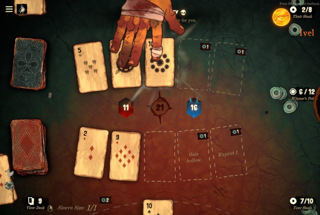Vous avez donc atterri en enfer, et, pour vous en échapper et sauver votre âme, vous allez devoir jouer à une version un peu particulière du black jack. Vous disposez d’une poignée de jetons d’âme et l’enfer est pavé d’accros au jeu qui vont tenter de vous en déposséder. A la manière de beaucoup de roguelikes, on progresse sur un arbre à choix multiples, alternant parties de black jack et divers petits évènements ou magasins vous permettant d’améliorer votre deck de cartes.