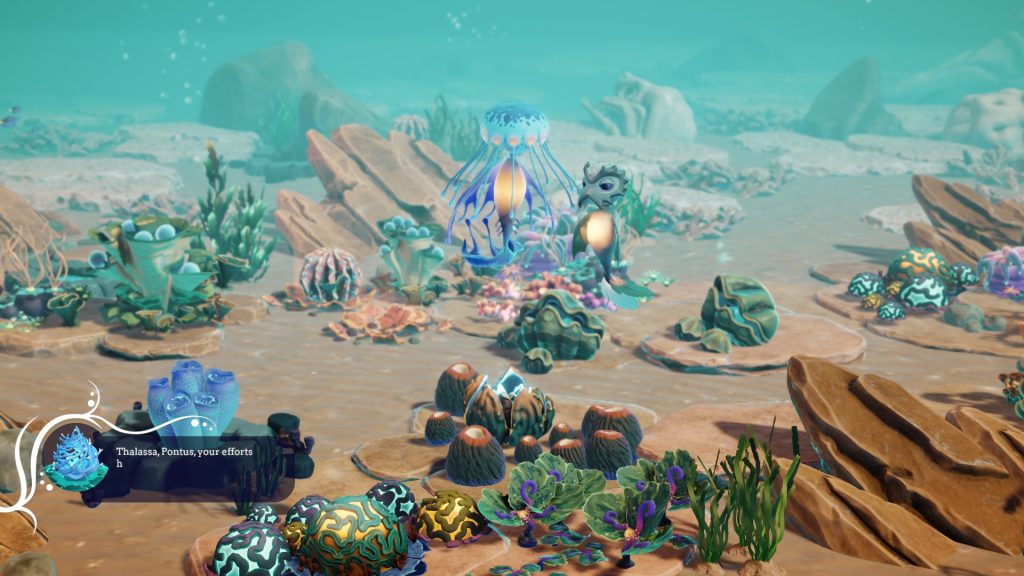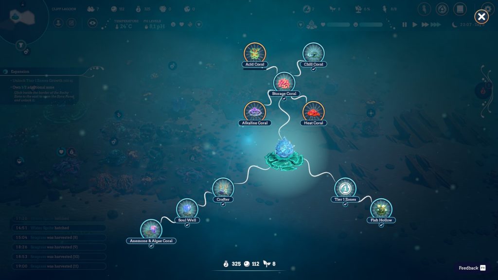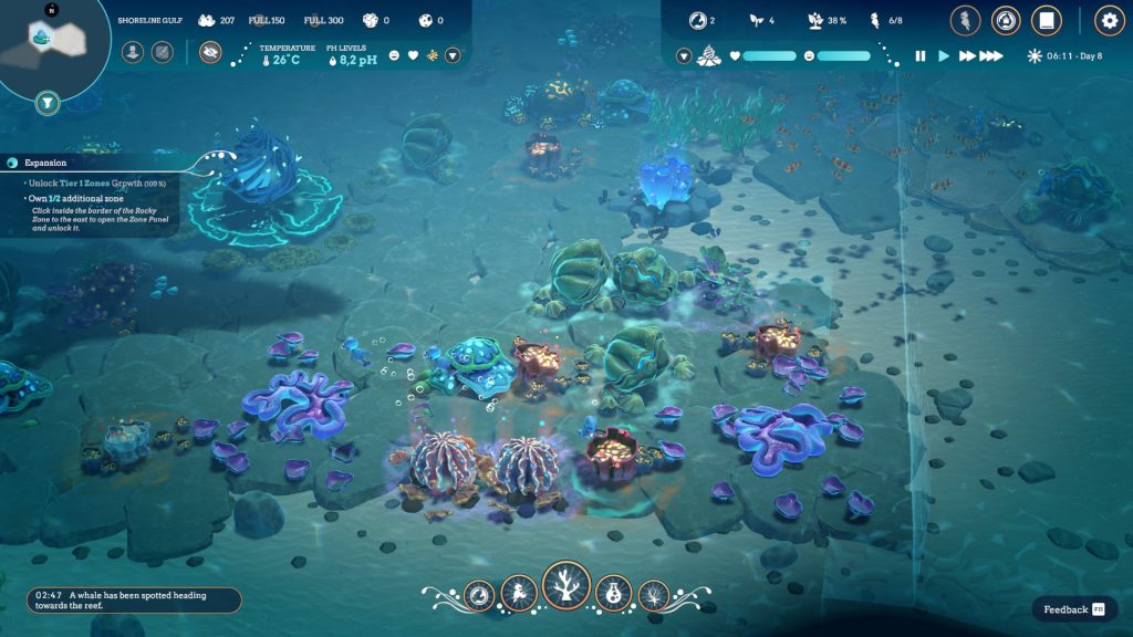 La recherche permet quant à elle de débloquer rapidement les outils indispensables à votre survie, notamment les coraux permettant de modifier le Ph ou la température, et la seule restante chose dont le joueur a à se préoccuper, c’est de décider où attirer la faune par le biais de petits appâts.