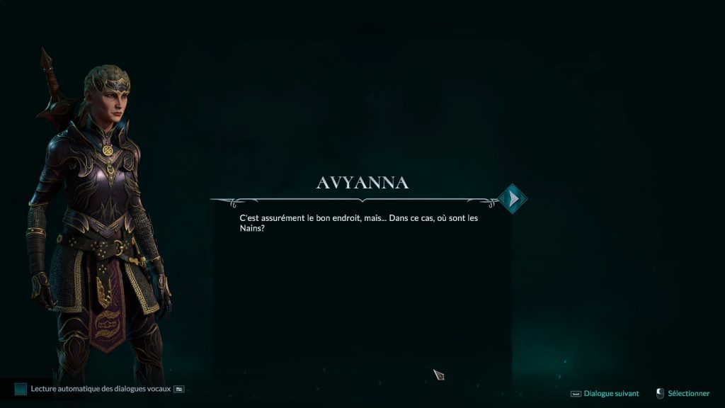 Les dialogues entre les différents protagonistes sont très nombreux. Le doublage, en anglais ou en français, est bien fait, même si l’on aurait peut-être aimé que la voix d’Avyanna soit plus autoritaires (c’est une reine, après tout). Par contre je vous rassure les nains pratiquent, comme il se doit, la consonne roulée alvéolaire voisée. A noter la très bonne qualité de la traduction française pour ce qui est des textes de l’interface et des dialogues. Bon, vous allez me dire que c’est la moindre des choses, vu que le studio de développement est français. Mais il faut le souligner, car cela n’est pas toujours le cas, même dans des jeux réalisés par des francophones.