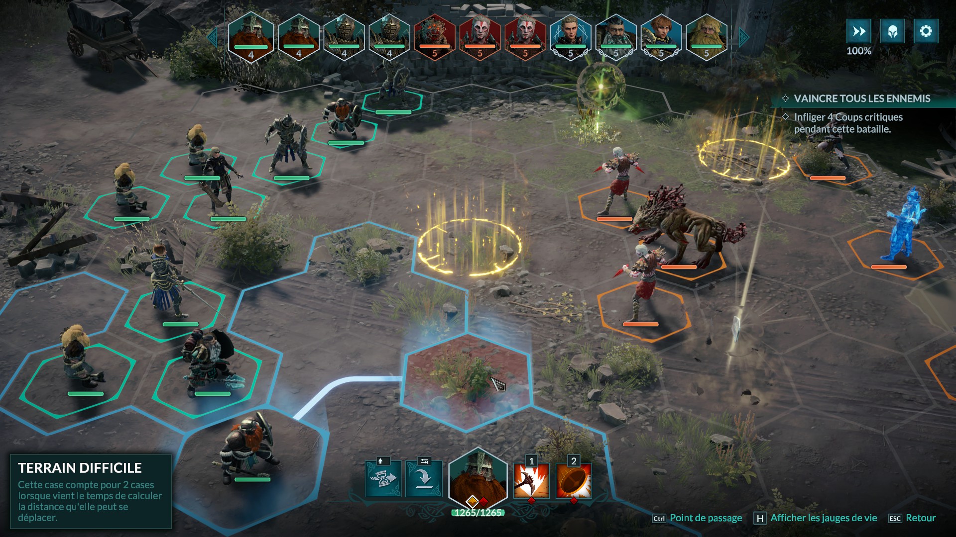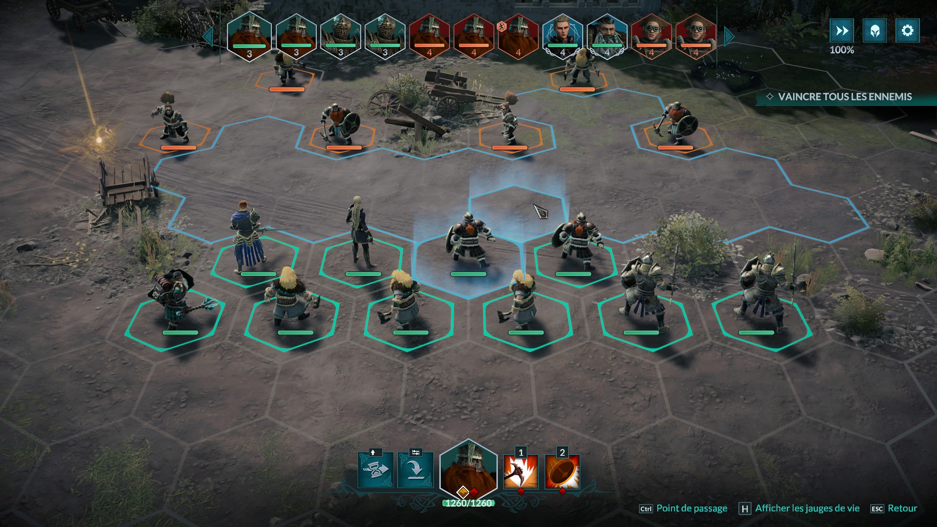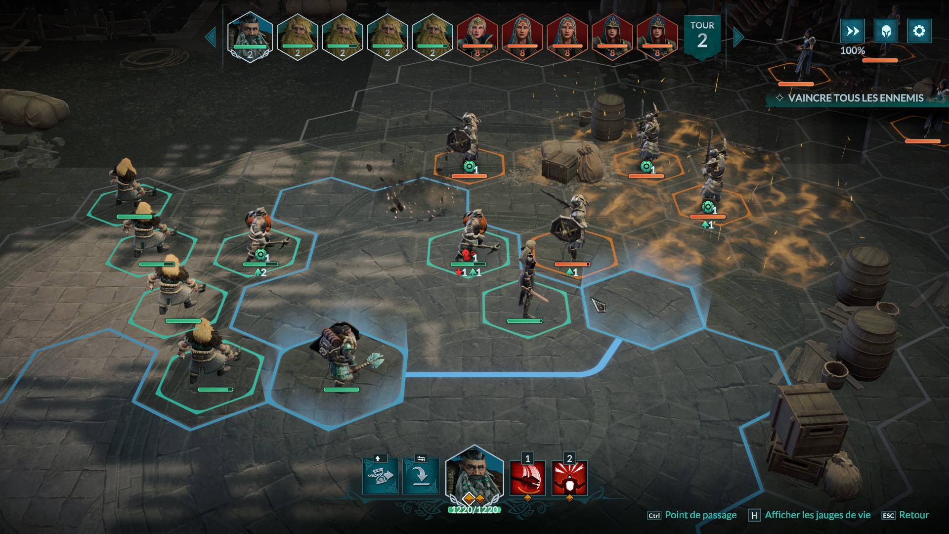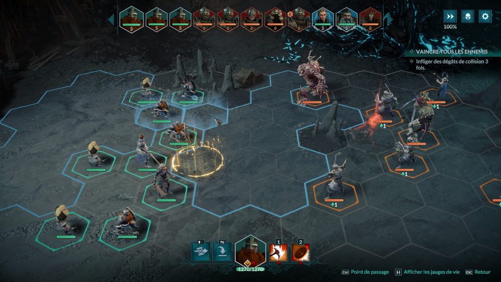 Les personnages ont également des points d’action (PA) afin d’agir (se déplacer, attaquer, activer des pouvoirs spéciaux, etc.). La particularité du jeu vient du fait qu’il existe plusieurs types de points d’action. Des points bleus pour se déplacer, des rouges pour utiliser une compétence, et des jaunes, plus flexibles, pour se déplacer ou utiliser une compétence. De plus, si vous ne dépensez pas tous vos PA durant votre tour, les points restant vous permettrons de soigner automatiquement un pourcentage de vos points de vie (les combattants reprennent ainsi leur souffle).
