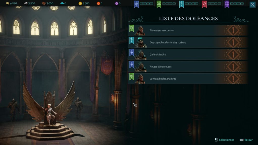 Votre palais inclus, bien sûr, une salle du trône où plusieurs factions vous demanderont audience. Surtout pour se plaindre en fait. Vous serez donc confronté à diverses doléances qui seront prétextes à des sous-quêtes vous faisant gagner ressources et récompenses et faisant avancer le récit en fonction de vos décisions. Vous aurez affaire à 5 factions différentes (les humains, les démons, les morts-vivants, les elfes et les nains), et s’assurer de leurs bonnes grâces vous permettra de recruter leurs unités pour étoffer vos forces.