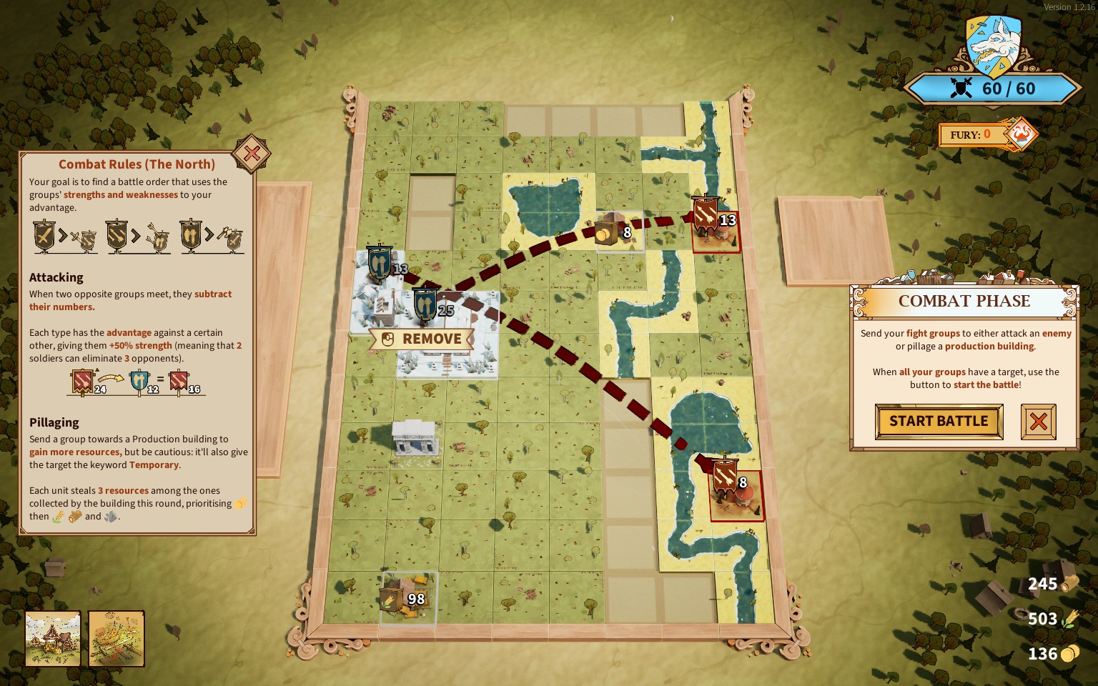 En effet, avec le Nord, vous avez aussi la possibilité, lors des phases de bataille, de piller les bâtiments de production. Vous pouvez ainsi obtenir de précieuses ressources supplémentaires. Cependant, si les bâtiments pillés font partie de vos cartes, leur carte correspondante sera détruite définitivement au cours dudit pillage. Attention à ne pas être trop gourmand, donc, au risque de rapidement brûler votre paquet de cartes.
