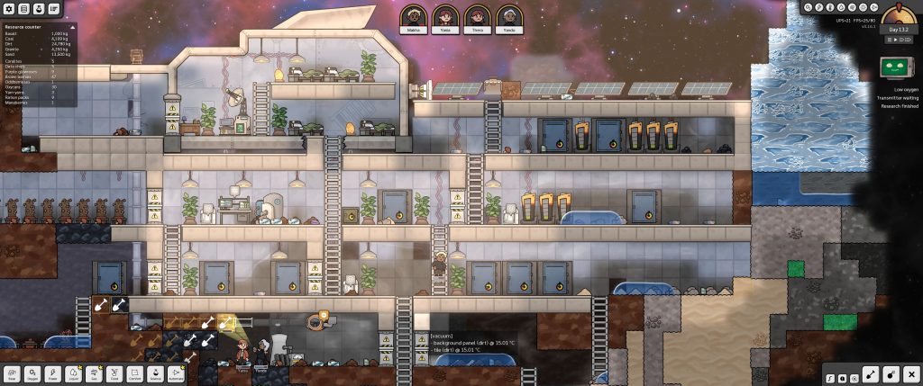 Comme dans son illustre aîné, vous allez devoir creuser le sol de la planète pour y construire les salles nécessaires à votre survie : ici ce sera un potager, là une salle pour les générateurs. Il faudra satisfaire les quelques demandes de vos rescapés – manger, dormir et… respirer – afin qu’ils puissent mettre au point les technologies vous permettant de vous carapater de cette planète.