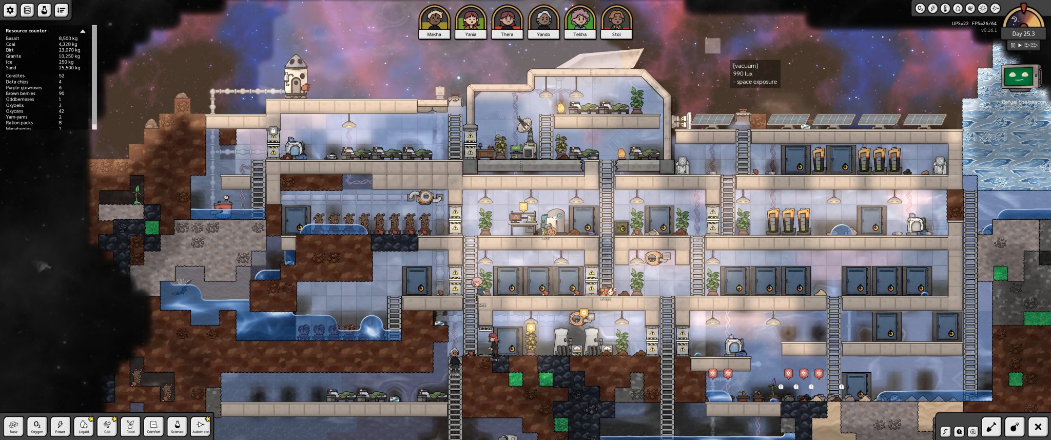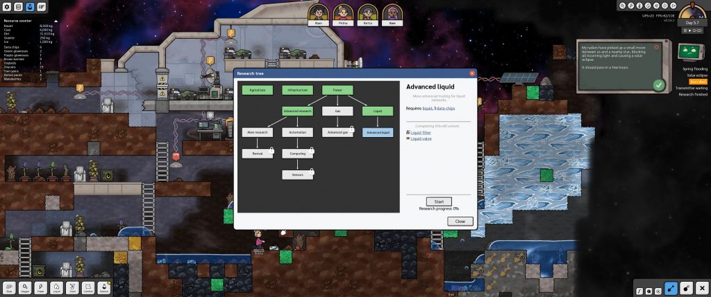 Les habitués des space colony sims ne seront pas dépaysés avec une gestion des priorités pour chacun et une planification des tâches. C’est du très commun, il suffit de quelques clics pour prendre ses marques. Ce qui était aussi indispensable, c’est la gestion des gaz et liquides, qui oblige à construire divers circuits et à bien cloisonner tout cela. En effet, vos astronautes ont la sale manie de mourir quand ils sont privés d’oxygène !