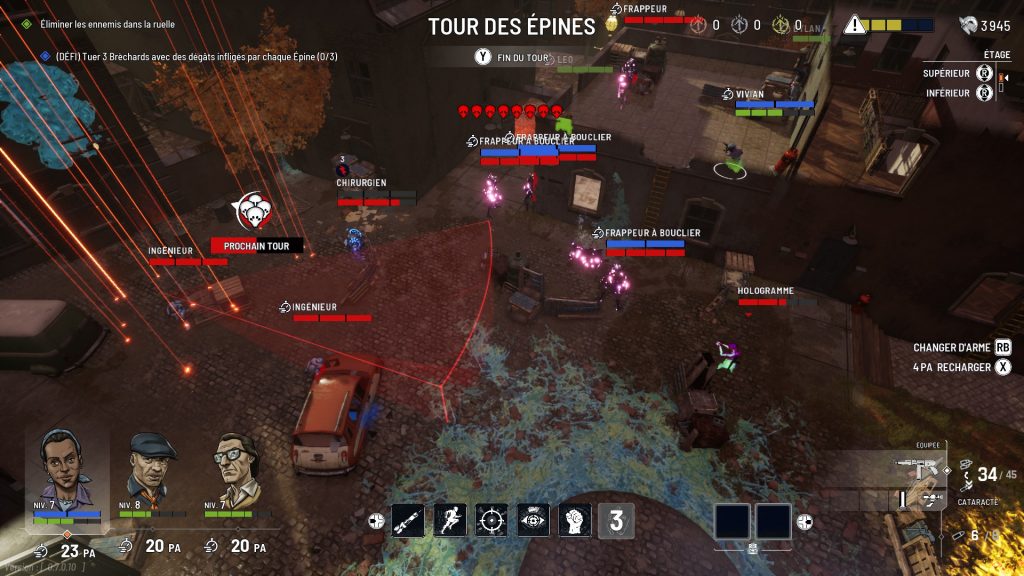 On fait très vite le tour de Every Day we Fight, la faute à un arsenal limité (3 armes principales, 12 au total) et seulement 2 compétences (fixes) par personnage. Je passe les subtilités mais en gros : Vivian jette un hologramme et se spécialise dans le kill assist, Léopold donne ses points d’action et tire à couvert, puis Dylan raille ses adversaires et peut les attaquer avec un coup de poing de proximité (équivalent d’une surveillance version mêlée). Mouif.