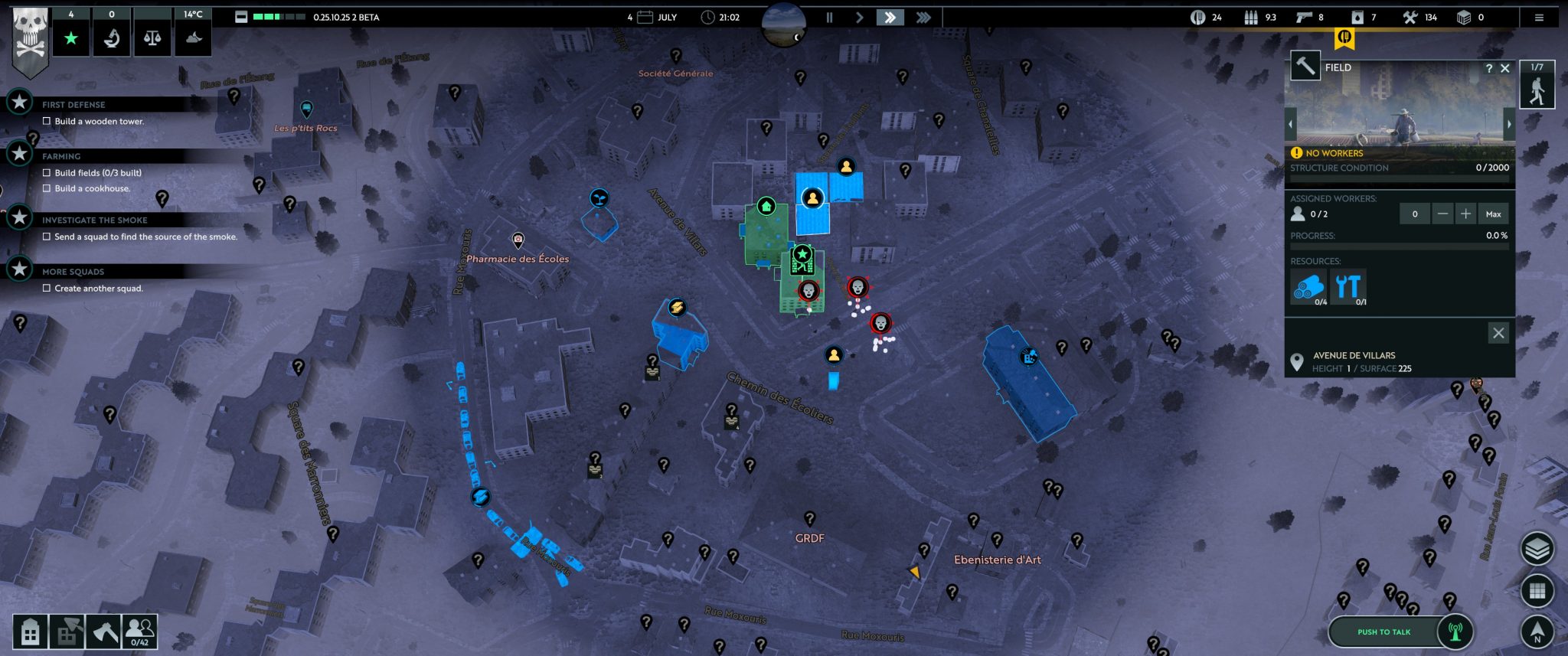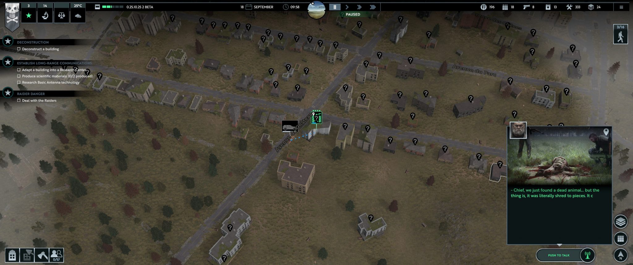 Il va donc falloir répartir sa main d’œuvre entre les ouvriers, qui reconstruiront votre ville, le personnel qui ira glaner des ressources ou qui s’occupera des bâtiments de production, les soldats qui assureront la sécurité et surtout les équipes d’éclaireurs. Vous enverrez tous les jours ces derniers dans les environs pour récupérer un maximum de matériel et de ressources.
