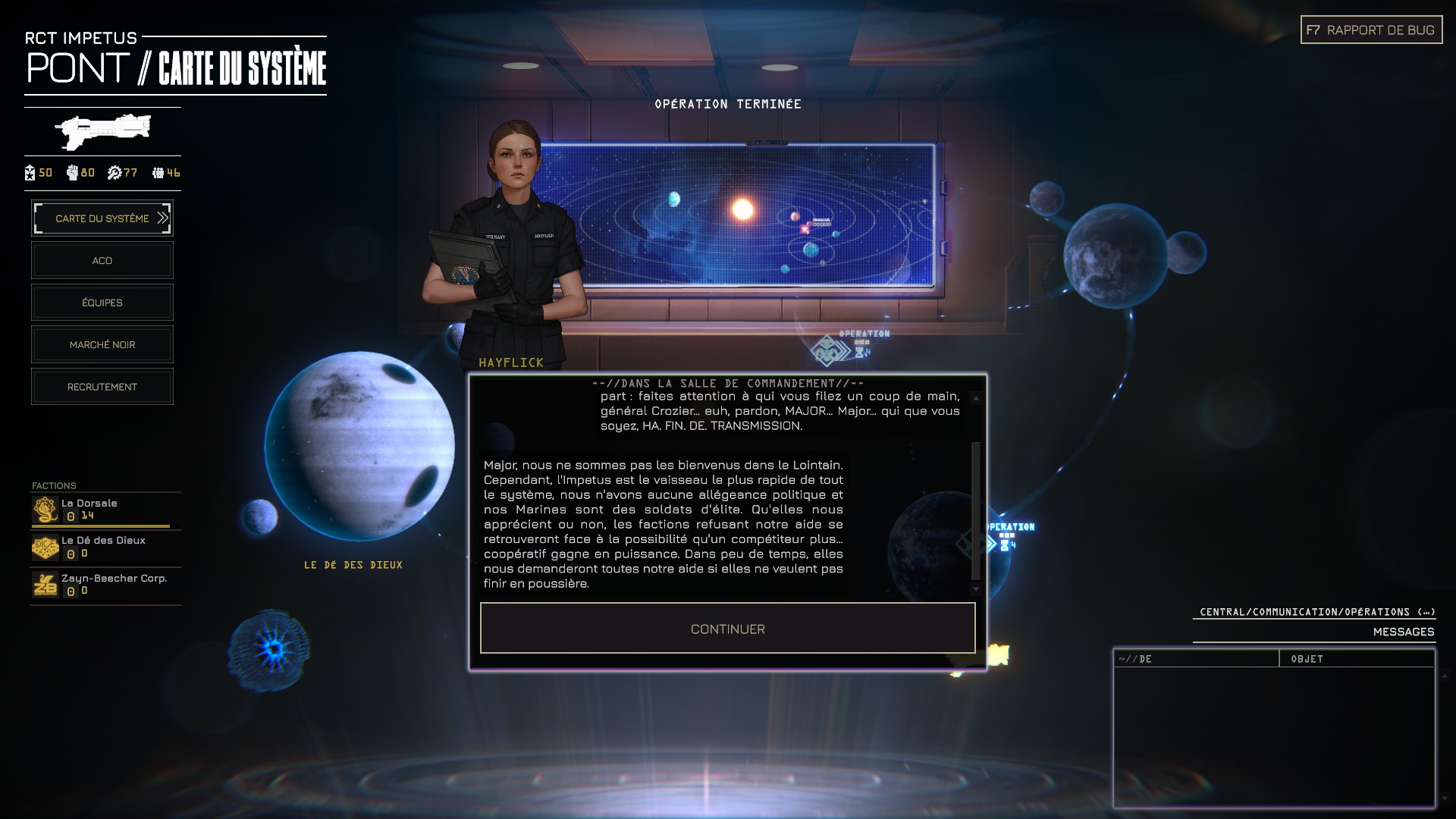 Les missions sont groupées au sein de mini campagnes composées d’affrontements successifs avec différents scénarios vous faisant progresser le long d’une arborescence (oui, des arbres en campagne c’est logique) vous permettant le choix entre plusieurs types de missions, vous faisant d’affronter plusieurs factions humaines telles que des pirates (comme pour la démo), des troupes renégates, mais aussi diverses espèces d’extraterrestres à l’aspect d’insectes sous stéroïdes. Tout ceci avant d’être confronté à la MENACE dont on ne vous divulguera pas la nature, si ce n’est que c’est un acronyme (oui, on ne soulignera jamais assez le danger des acronymes).