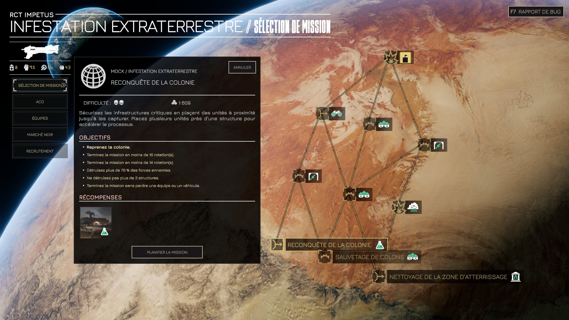 Il est à noter que les missions sont générées de manière procédurale, ce qui assure leur variété. De même les objectifs sont assez divers, cela va du classique ‘exterminez les tous’, à la sauvegarde de colons en danger (non, là je ne parle pas de la lutte contre la colopathie fonctionnelle), en passant par la récupération de divers artéfacts (comme des échantillons extraterrestres par exemple), la défense de zone, le sabotage d’installations ou encore la capture de positions stratégiques. A cela s’ajoute des objectifs secondaires rapportant des ressources supplémentaires. Il y en a donc pour tous les gouts.