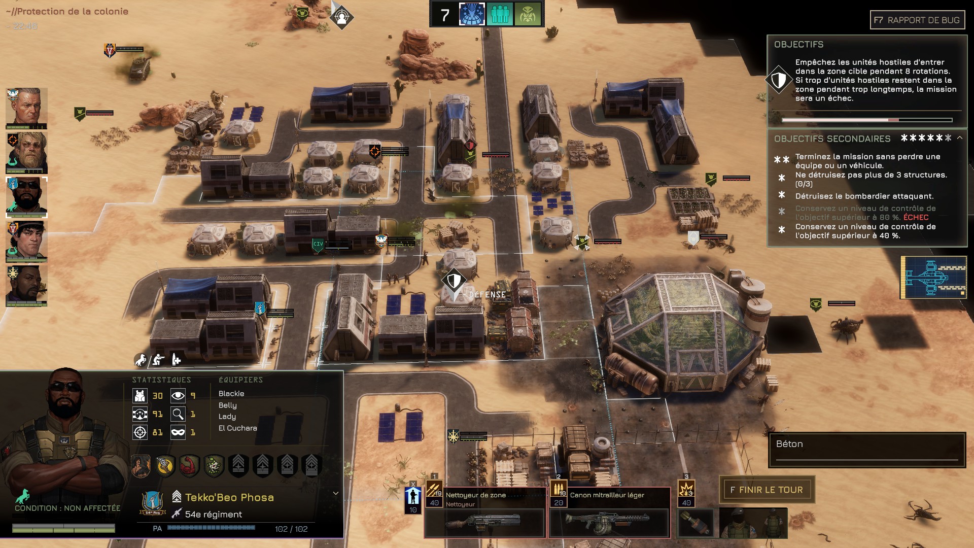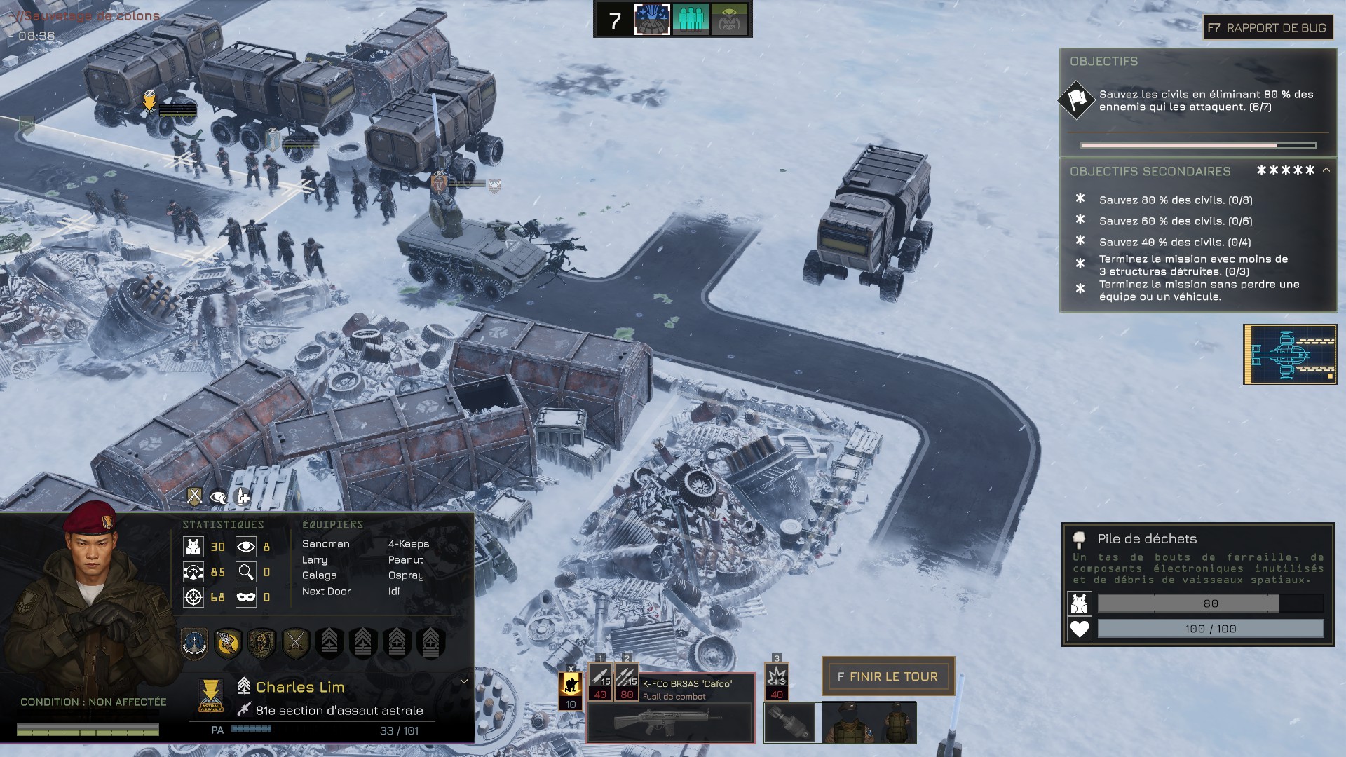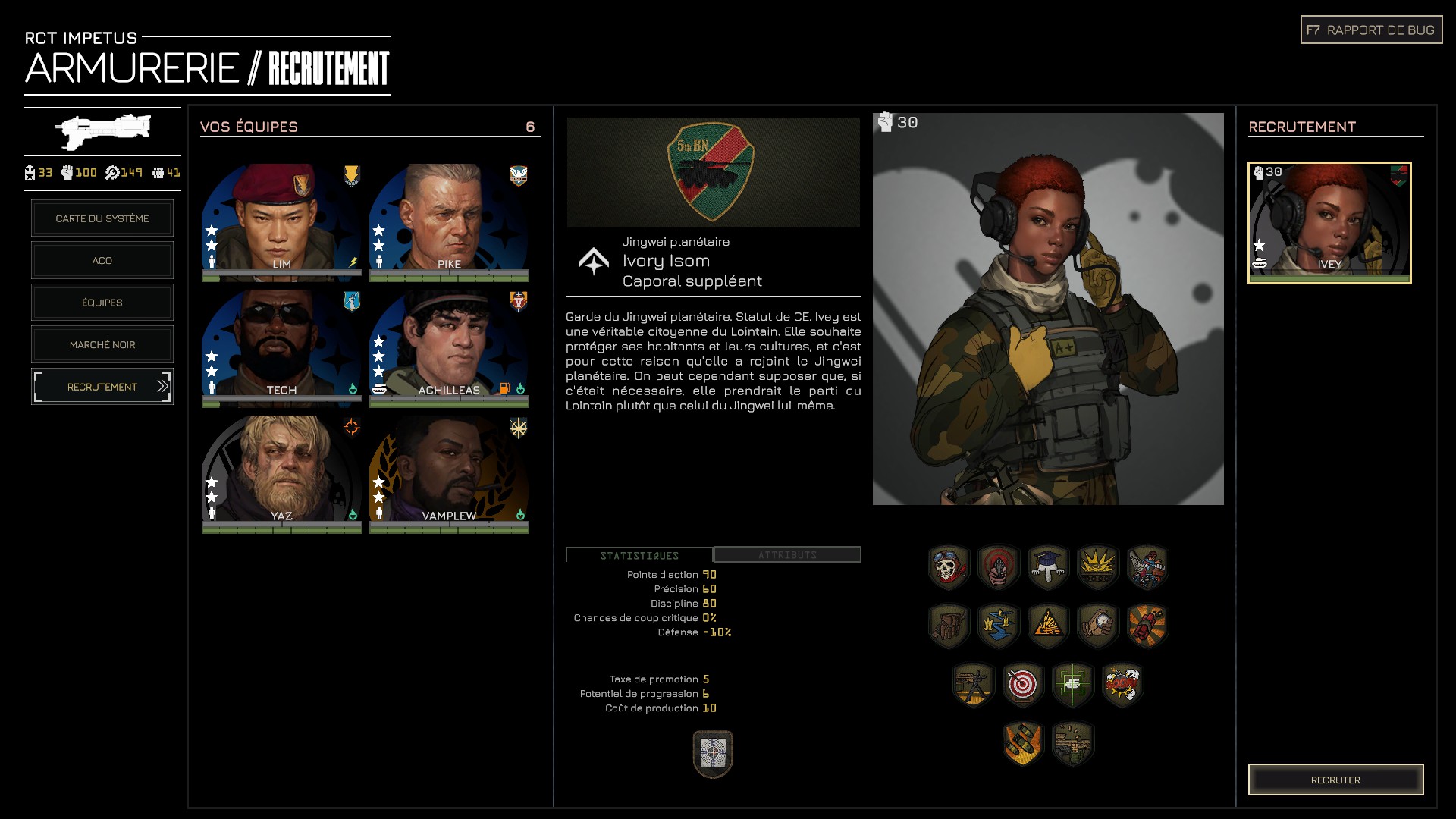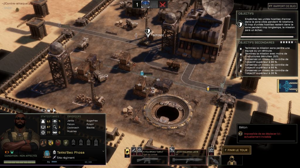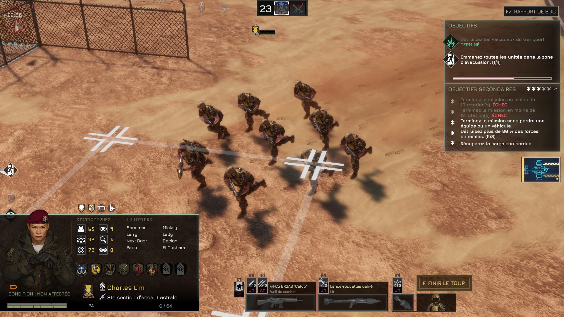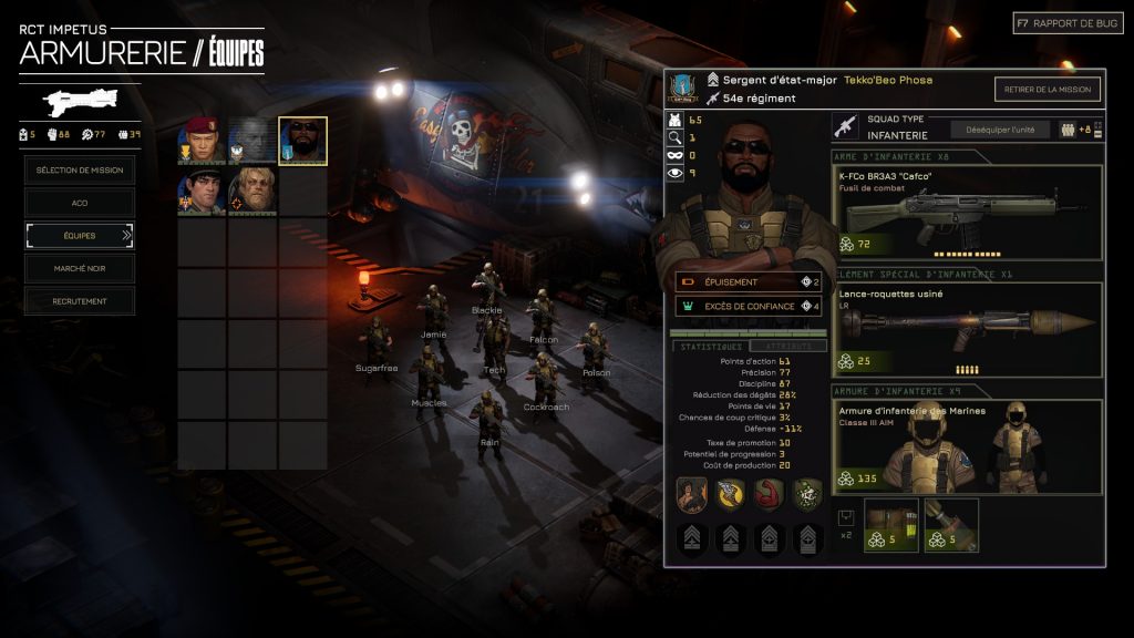 Non, là je ne parle pas de cuisine, mais du fait qu’ils soient plus ou moins doués pour la reconnaissance, l’appui, le tir, la furtivité, etc. A vous donc de leur assigner le bon matériel pour leur permettre d’accomplir leur mission dans les meilleures conditions. La fatigue de vos commandants est, bien sûr, également prise en compte. Faites les enchainer trop de missions et ils seront épuisés et leurs caractéristiques (en particulier leurs précieux points d’action) en pâtiront. Il faut donc prévoir une rotation des effectifs.