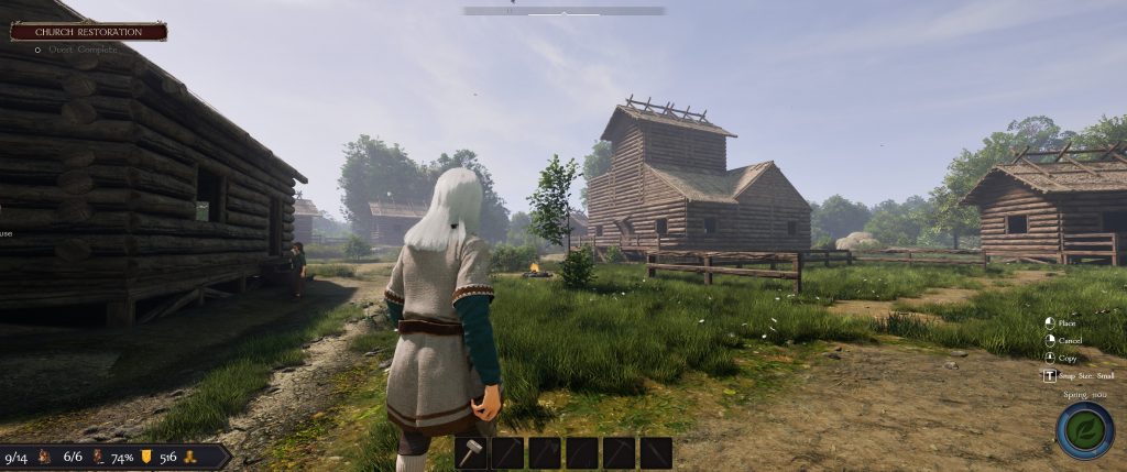 L’interface de construction n’est malheureusement pas la meilleure que j’ai vue, avec une tendance à nous faire multiplier les clics inutiles. Le placement des murs, bouts de toit et autres est assez simple tant qu’on reste dans le basique. Mais bon, comme pour le moteur physique, on voit qu’on est encore dans un Early Access et qu’il y a encore du boulot derrière.