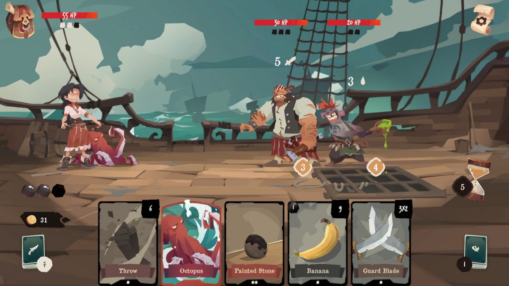 Les défauts de l’Early Access se font malgré tout bien sentir sur plusieurs points. Commençons par regarder le système de munitions et de la gestion des tours. Contrairement au modèle classique de ce genre de jeux, Pirates Outlaws 2 possède un système hybride. D’une part, les munitions, sorte de points d’action, sont souvent utiles pour les attaques à distance ou les soins, mais les attaques au corps à corps en nécessitent rarement. De l’autre, les tours ne s’alternent pas forcément de façon uniforme. Chaque carte jouée, à moins d’une spécificité inverse, fait avancer le compteur, mais repiocher votre main entière peut aussi nécessiter plusieurs tours accordés à l’ennemi. Et terminer votre tour de cette façon ne recharge pas non plus vos munitions.