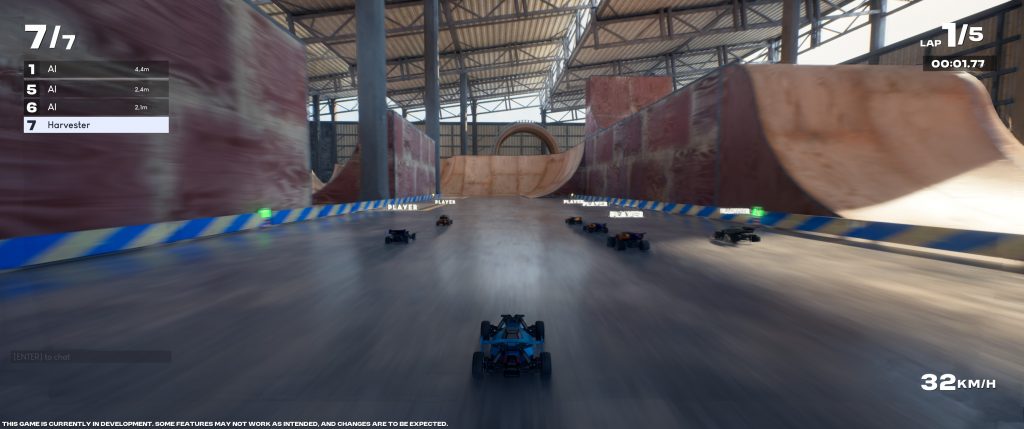Il y a pour le moment un seul mode de jeu en solo, la course contre des IA sur 11 circuits différents. La difficulté pouvant être paramétrée, c’est un mode idéal pour se faire la main avant de monter doucement mais sûrement en gamme. Les circuits sont – d’après la fiche – inspirés de circuits professionnels donc offrent une grande variété de décors : entrepôts, fête foraine, stade…