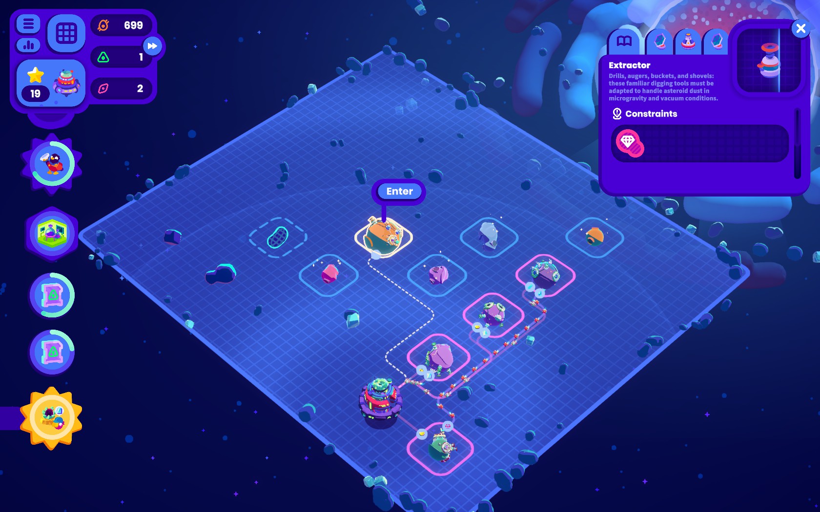 Les principales mécaniques consistent donc à connecter les différents modules d’extraction et de traitement des ressources entre eux, qu’ils soient côte à côte ou sur différents astéroïdes. Si le jeu devient un peu plus complexe au fur et à mesure que l’on progresse dans les chapitres, il est évident que nous sommes là sur une version simplifiée d’un simulateur d’usine.