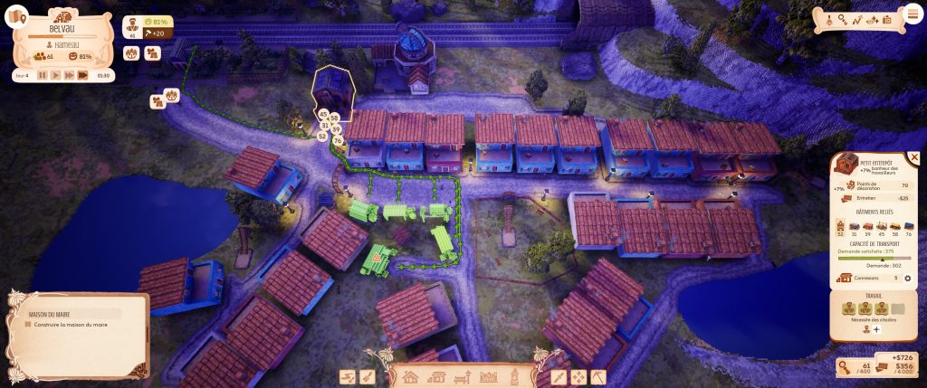 Et tout est comme ça : on veut rajouter une boutique de chapeau, mais il n’y a pas assez de travailleurs. Mais rajouter des maisons au pif n’est pas optimal, mieux vaut satisfaire les demandes des gens, ils travailleront mieux comme ça. Alors on aménage un quartier comme ils veulent. On optimise les livraisons des entrepôts. Pas au millimètre hein, on dit juste qui doit desservir quoi. En quelques clics.