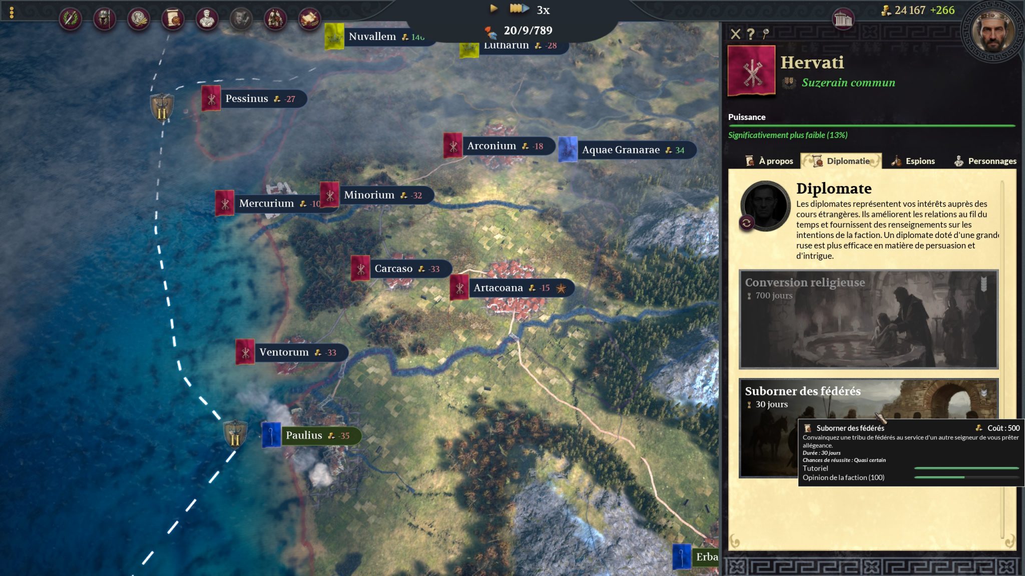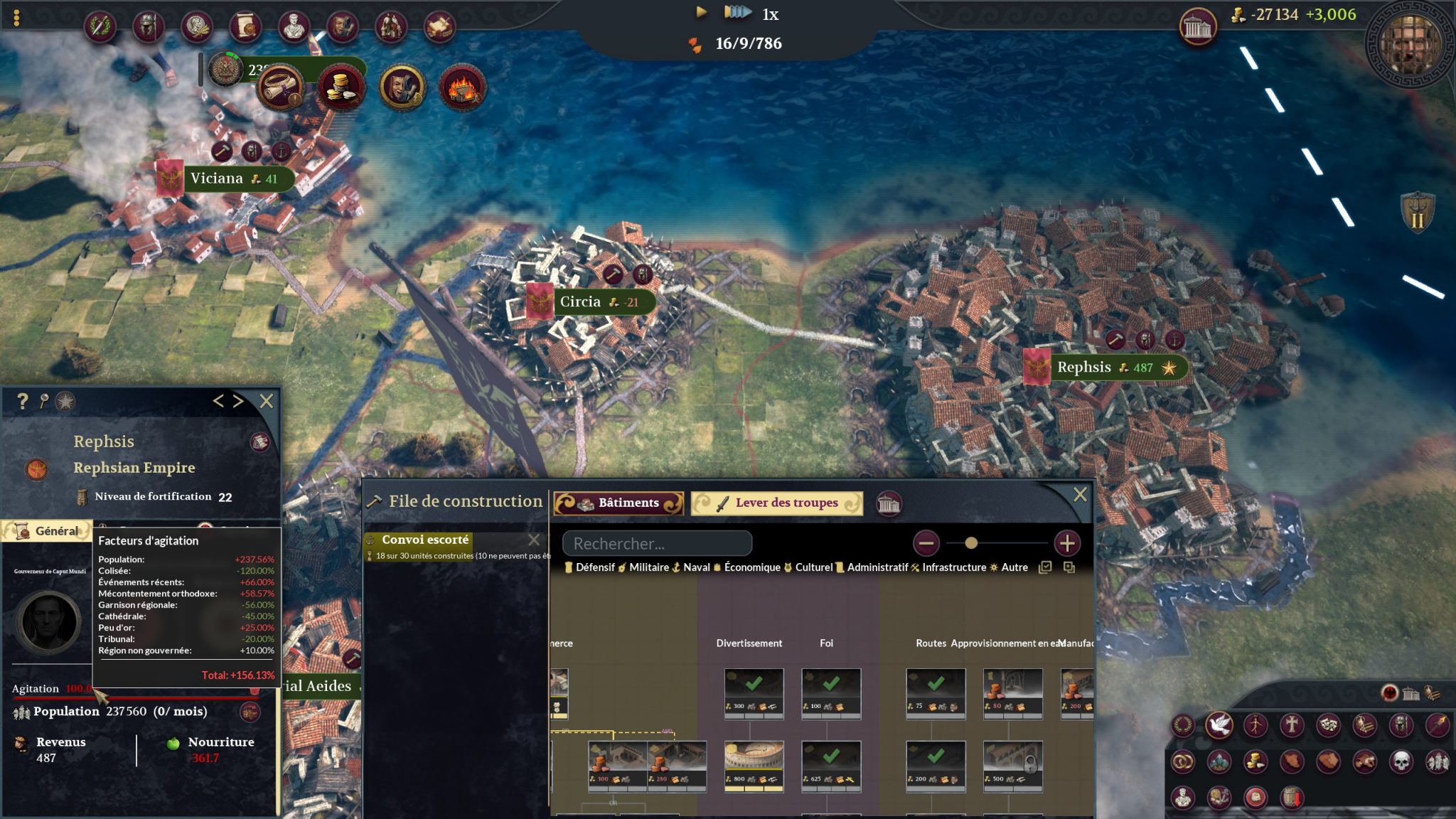 Le jeu se base principalement sur l’équilibre que vous pouvez amener à votre Empire que ce soit niveau religieux, intégration culturelle et/ou contentement des personnages clés. En tout cas, il vous en donne les possibilités. Dans les faits, j’ai surtout remarqué que vous passez beaucoup de temps à écraser les rebellions à coups de gladius. Déjà parce que les événements s’enchaînent (trop) vite, qu’il y a encore quelques bugs gênants, que l’interface n’est pas la plus réactive ni user friendly qui soit et finalement que si ça fonctionne de juste écrabouiller tout ceux qui sont en désaccord, pourquoi se priver ?