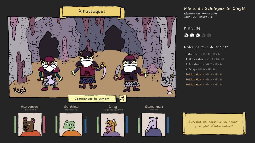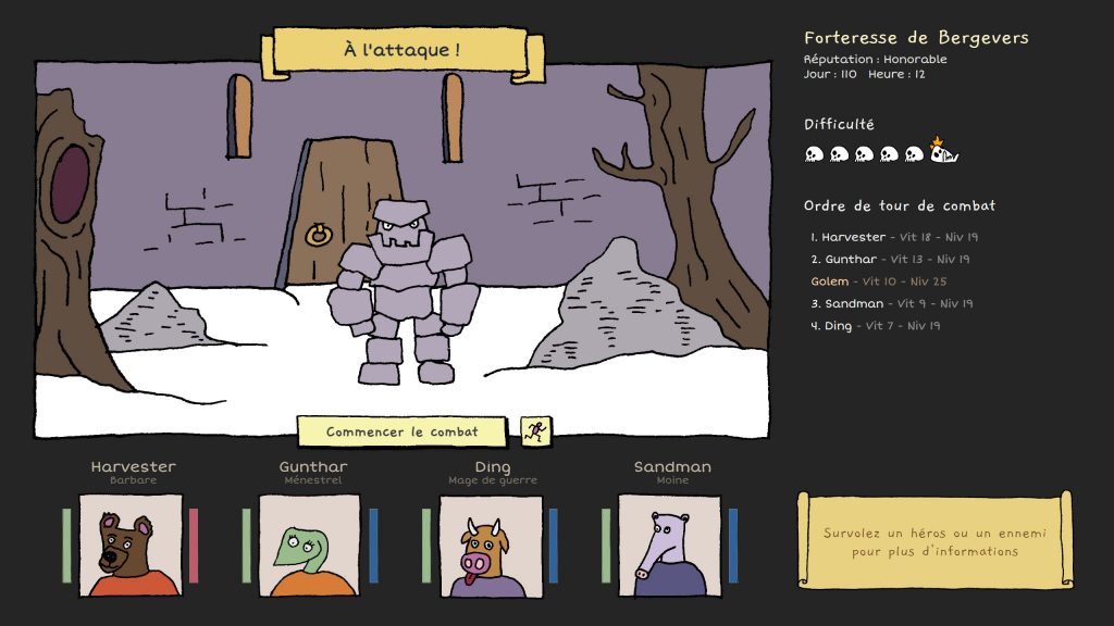 Nom, tête, classe de personnage et vous êtes prêts à aller arpenter la première île de Heroes of the Seven Islands. J’ai opté pour un mage de guerre, Harvester incarne un barbare (comme dans la vraie vie !) et j’ai ajouté Sandman comme moine du groupe et un certain Gunthar (??) le ménestrel nous accompagnera également dans cette quête pour sauver le monde !