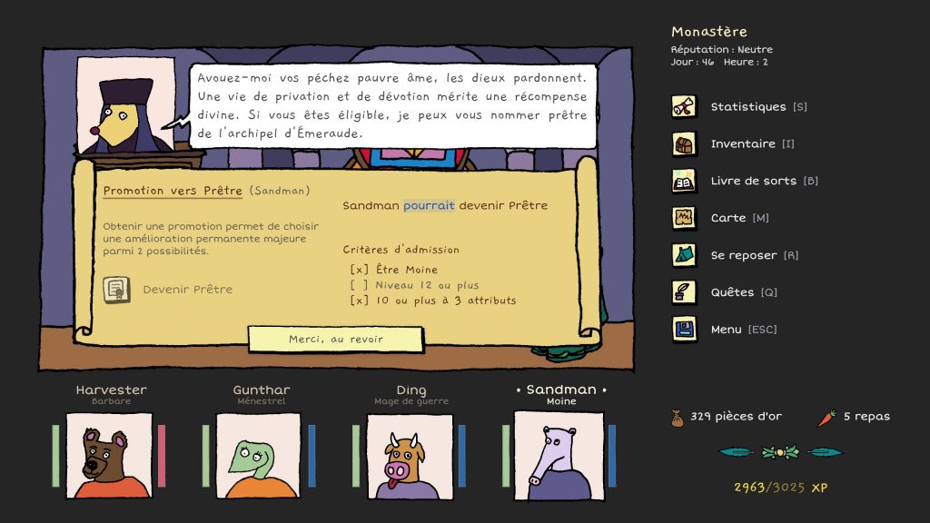 Au gré des aller-retours sur les îles, des missions parfois absurdes (à dessein !) et des références plus ou moins subtiles à l’univers de l’heroic fantasy et du gaming, il vous faudra entre 5 et 10 heures pour terminer Heroes of the Seven Islands. Cela peut paraître court mais en ce qui me concerne je n’ai jamais joué plus d’une heure par session.