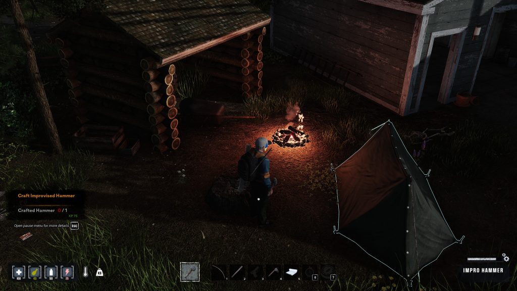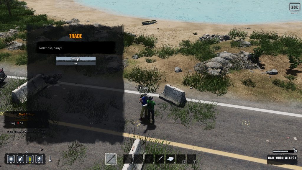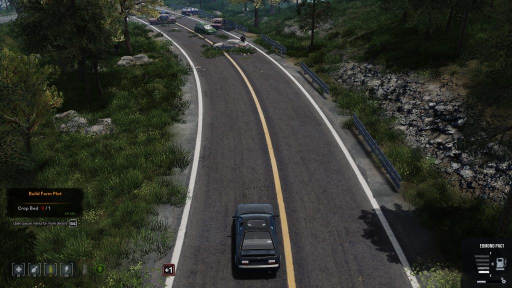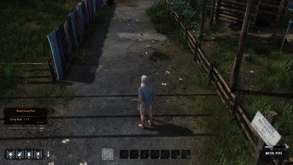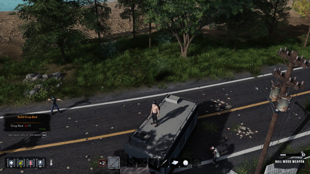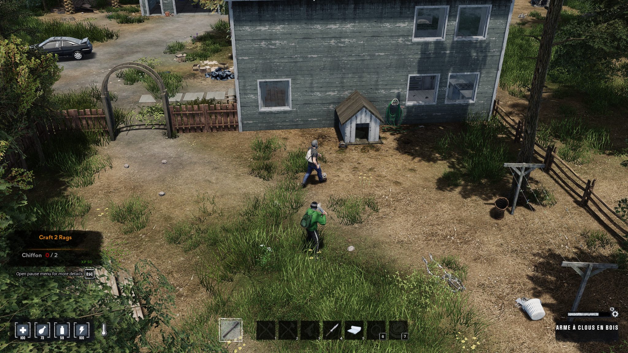 Une maison, quelques dépendances et une voiture en piteux état nous entourent. Charge à nous de rassembler assez de matériaux utiles pour construire des installations et autres postes de travail permettant d’étendre nos possibilités de production d’objets divers et variés. N’hésitez pas à détruire les meubles présents dans les bâtiments, ils représentent une source précieuse de matériaux. Combiner nos forces permet de gagner un temps précieux et d’élargir le champ des fouilles, tout en étant BEAUCOUP plus résilient face aux zombies. Il ne faut pas hésiter à fuir pour revenir plus tard en mode furtif pour remplir son sac !