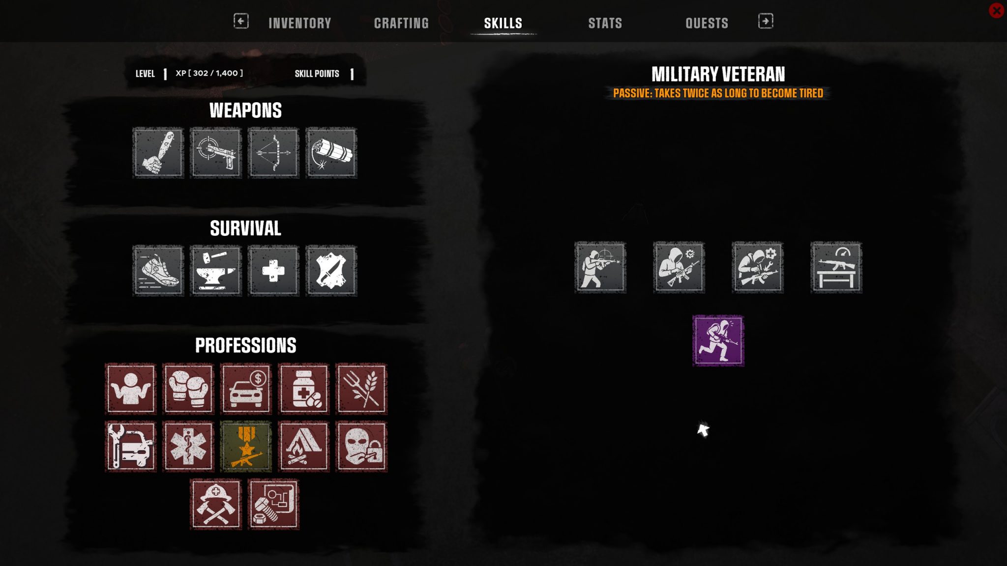 Cela détermine un axe de compétence de base mais ne limite cependant pas sa progression. Remplir des objectifs (tuer des zombies, fabriquer des objets…) permet de débloquer des cases sur lesquelles on viendra dépenser nos points de compétence au fur et à mesure de la partie et ainsi améliorer les capacités de notre héros.
