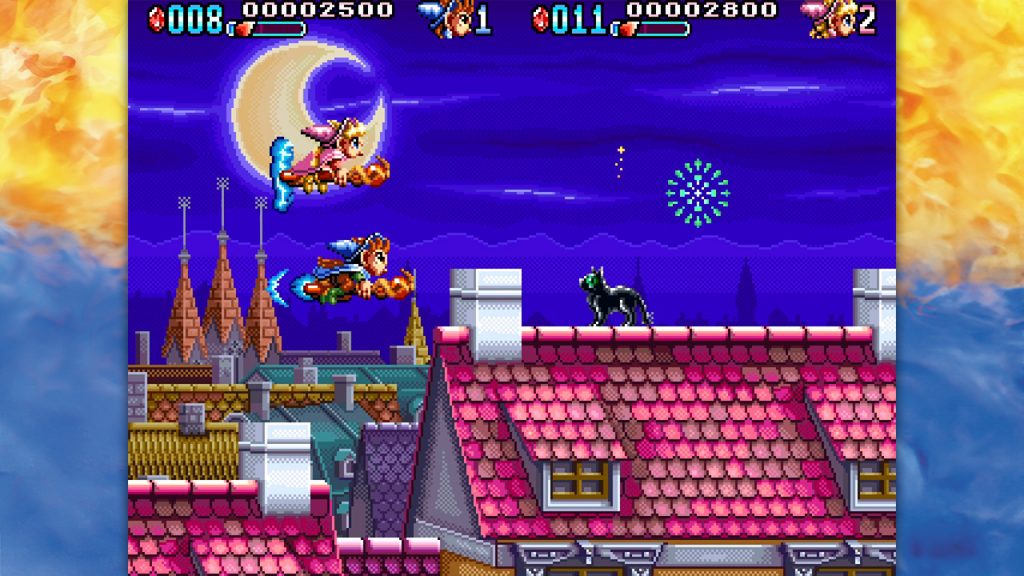 Mystic Riders est donc le troisième titre de cette compilation et il conviendra de le voir un peu comme le jeu le plus « grand public » des trois qui nous sont ici proposés. Avec son univers de fantasy, ses graphismes chatoyants et ses gros sprites tout ronds et mignons, Mystic Riders, sorti en arcade en 1992, donne un peu l’impression d’être la version plus enfantine et légère d’un shoot’em up estampillé IREM.