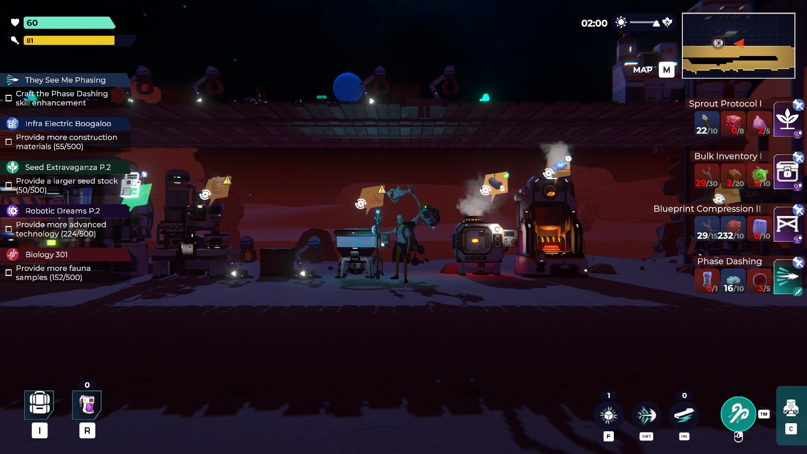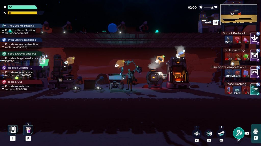 Globalement, Kentum est fun, mais il est loin d’être parfait. Par moments, on a même l’impression d’être dans un jeu en Early Access tellement les problèmes de qualité de vie pour le joueur viennent s’accumuler et rendre les choses pénibles. Par exemple, comme je vous l’expliquais plus haut, beaucoup de choses sont automatisables, et la source de beaucoup de ces automatisations sont basées sur la récolte de plantes et matériaux dans des jardinières. Oui, mais voilà, lesdites jardinières doivent être régulièrement arrosées, et il est tout bonnement impossible d’automatiser cette tâche. Pire, même lorsqu’il pleut sur vos plantations, ça ne les hydrate pas. Toute votre chaine de production peut donc être bloquée jusqu’à ce que vous alliez manuellement débloquer tout ça.