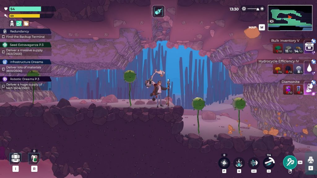 Dans Kentum, l’exploration est essentielle, ne serait-ce que pour collecter de nouvelles ressources. C’est là qu’entre en scène le côté metroidvania du gameplay. L’exploration se fait en vue latérale et chaque nouvelle amélioration de votre outil universel vous permet d’accéder à de nouvelles zones de la carte. De même, le jeu dispose d’un système de saisons, qui modifient aussi la faune et la flore locale. Souvent, revenir plus tard avec de nouveaux outils ou au cours d’une saison différente vous permettra d’étendre les endroits (et donc les ressources) auxquels vous pouvez accéder.