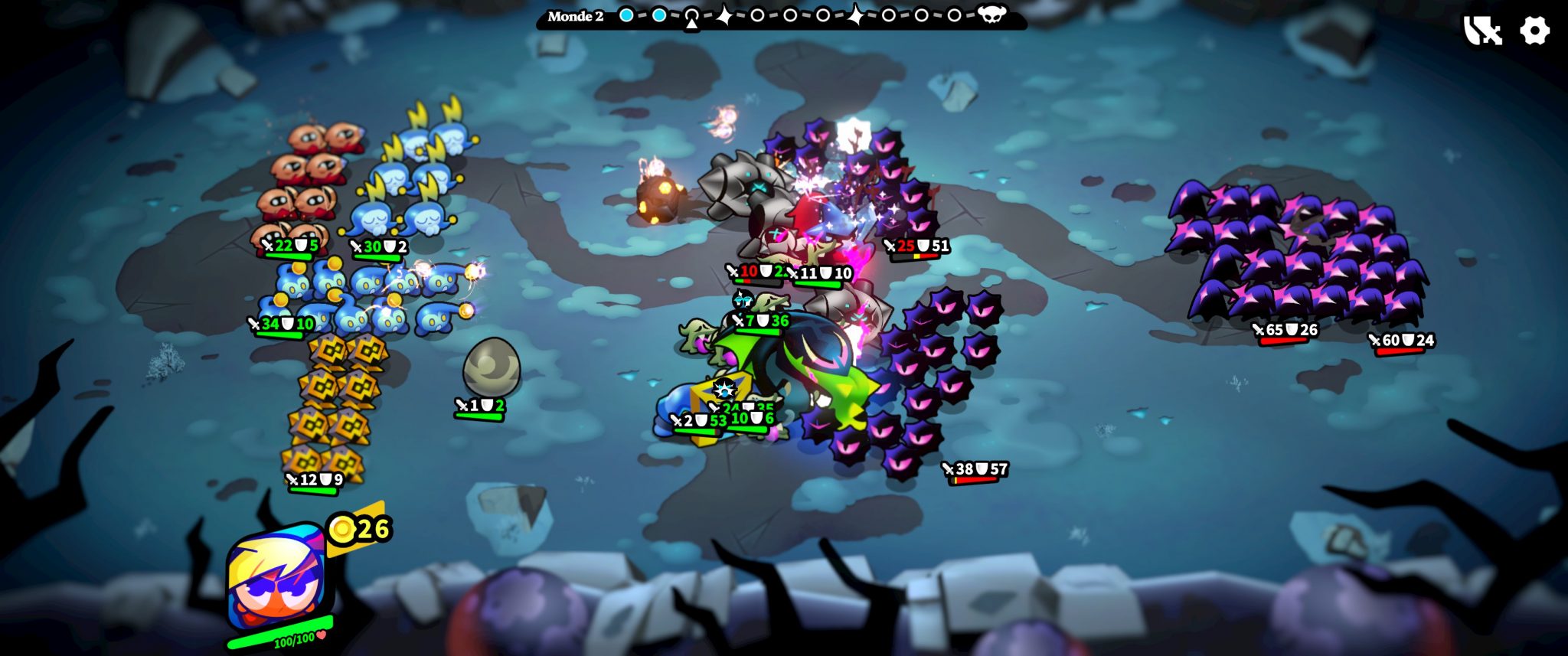 Chaque héros disposant de capacités spéciales, il va vous falloir faire un (ou plus raisonnablement plusieurs) run pour apprendre à les exploiter. Il en est de même pour les unités que vous pourrez acheter à chaque début de bataille. Il y a de tout : des chevaliers, des sorciers, des ogres, des dryades, des zombies, des dragons (que vous achetez à l’état d’oeuf !), certaines spécialisées dans le corps à corps, d’autres offrant des bonus au début de la bataille ou à leur mort et elles ont toute une faction d’origine.