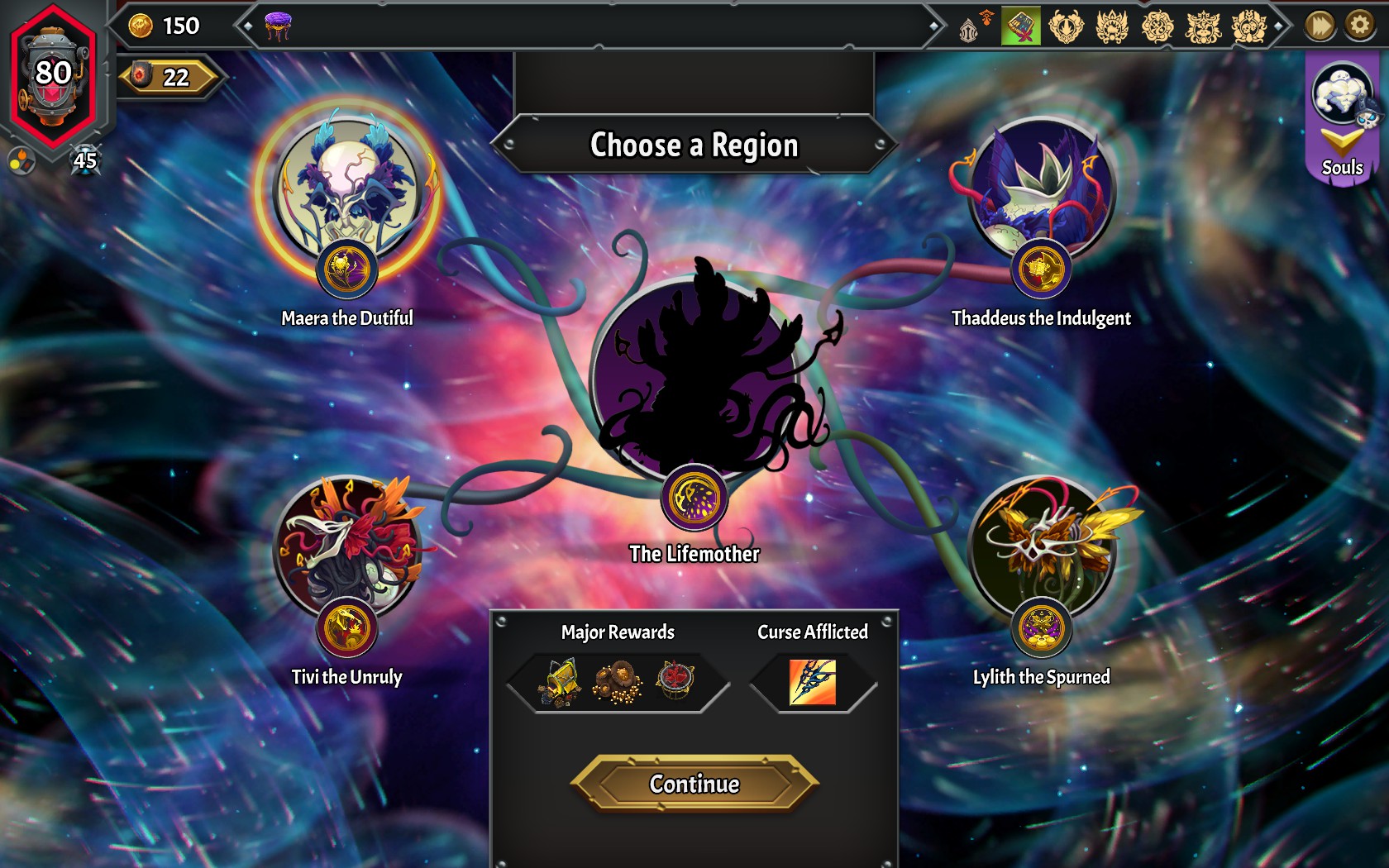 Ce nouveau mode introduit également, comme son nom l’indique, un nouveau concept d’âmes, que vous pouvez attacher à vos cartes. Il y en a énormément de différentes à débloquer puis améliorer en remplissant des objectifs pendant votre partie. Vous pourrez ensuite choisir jusqu’à trois de ces âmes pour vous aider au cours de votre run. Elles s’attachent à vos cartes, mais n’y sont pas liées de façon permanente et vous pouvez réévaluer votre stratégie en cours de route. Ces âmes donnent surtout des bonus non négligeables aux cartes auxquelles elles sont appliquées et pourront changer l’issue de votre partie, si elles sont bien utilisées.