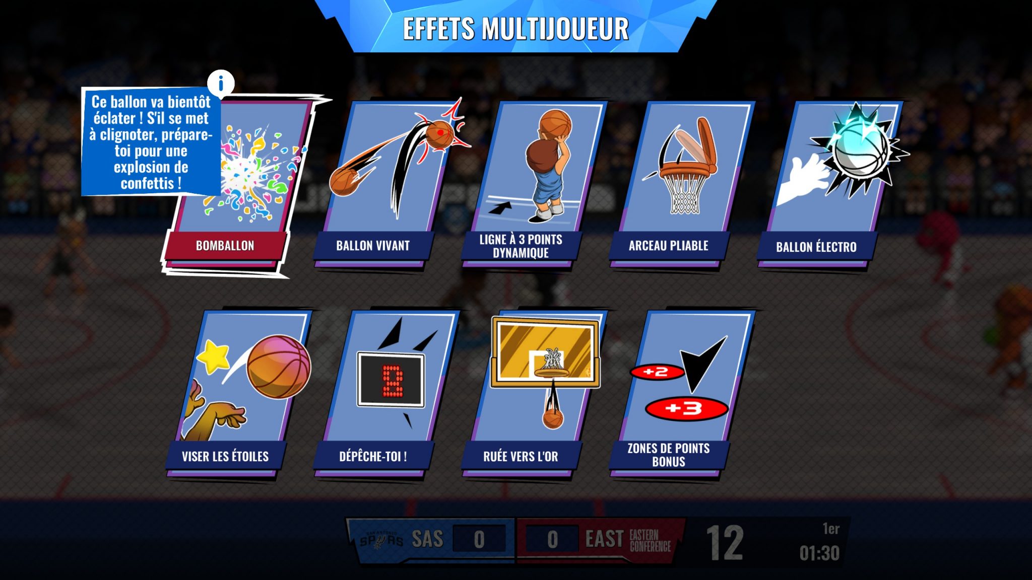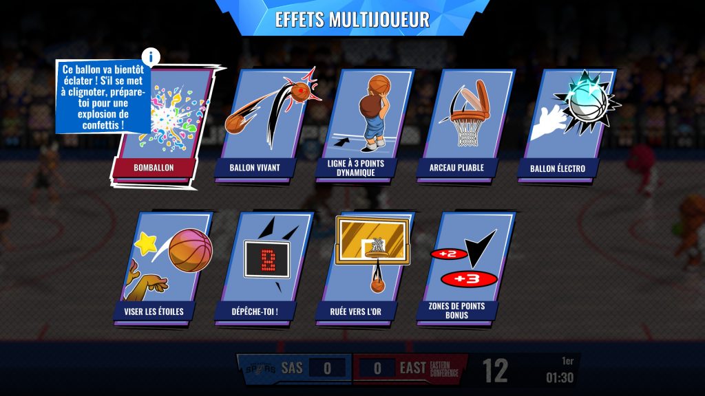 On peut jouer des parties rapides mais également des phases de playoffs ou des championnats, le tout entièrement configurable. Un mode un peu délire permet d’ajouter des événements aléatoires à chaque quart-temps durant le match parmi une dizaine : un couvercle qui recouvre l’arceau de temps en temps, la ligne à 3 points qui bouge, le ballon qui explose etc. Cela ajoute encore un peu plus d’amusement et de rigolade à plusieurs.