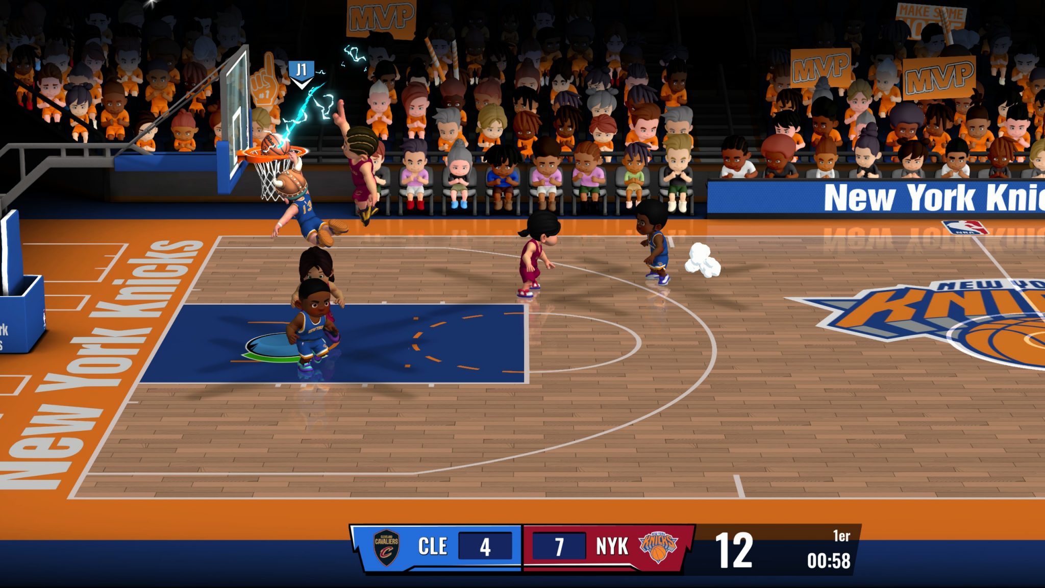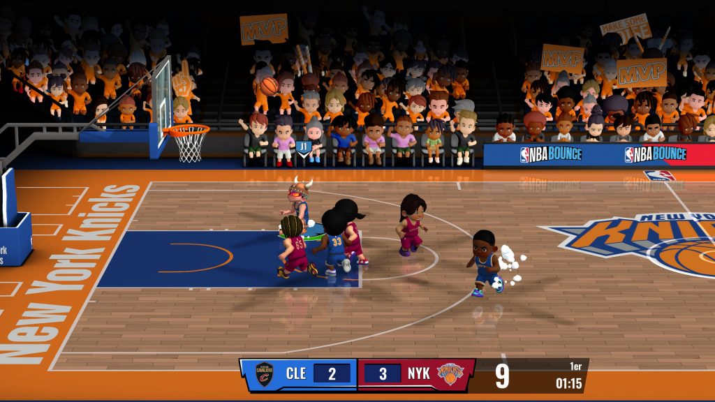 A la place, vous contrôlez des petits personnages amusants, prédéfinis ou modifiés par vos soins et même les mascottes officielles de la NBA ! Tout se passe en 3 vs 3 endiablé, avec des dunks à la NBA JAM, des contres stratosphériques et des alley hoops millimétrés. La défense est également importante et vous pouvez contrer ou intercepter le ballon, tout est une question de placement, de réflexes et de chance.